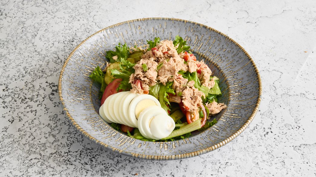סלט טונה, מלפפון חמוץ, פלפל אדום, בצל ירוק וחסה