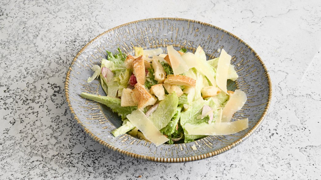 רוטב קיסר, חסה, בצל סגול, קרוטונים ועגבניות שרי