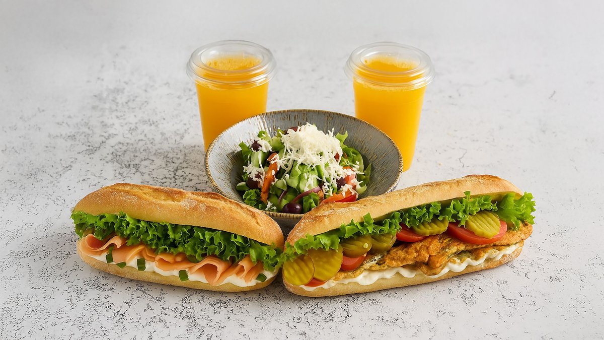 שני כריכים טריים, סלט לבחירה ושני משקאות סחוטים טריים = ארוחה מלאה ומפנקת לזוג.