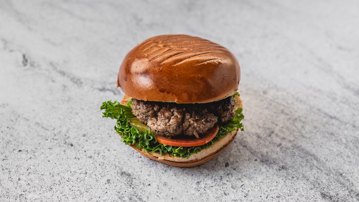 165 גר׳ קציצת בקר בלחמניה עם חסה, עגבניה, מלפפון חמוץ ובצל סגול