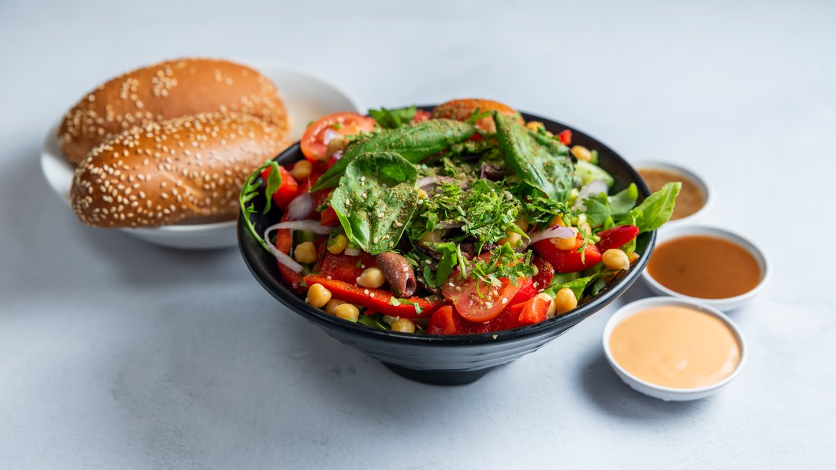 עלי בייבי, כרוב, מלפפון, בצל סגול, עגבניות שרי, צנונית, מלפפון חמוץ, פטרוזיליה, בצל ירוק זיתי קלמטה, בטטה ושווארמה טבעונית מומלץ להזמין עם טחינה ווינגרט חרדל ודבש
