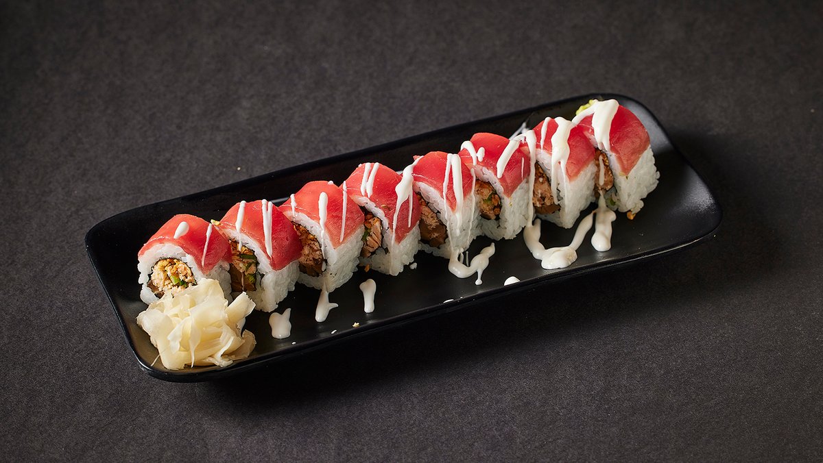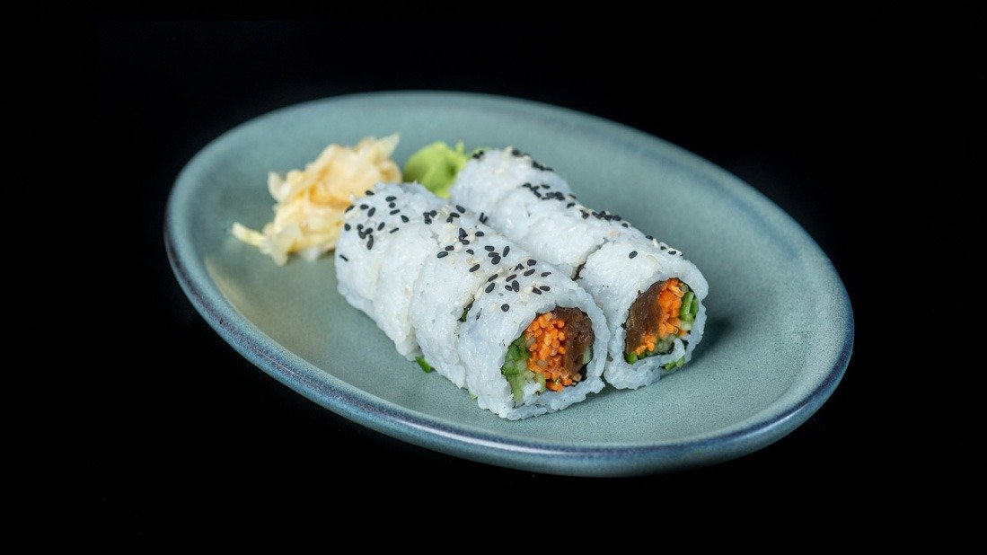 טונה, אבוקדו, בצל ירוק, ספייסי מיונז ורוטב צילי חריף, בציפוי טוגרשי.