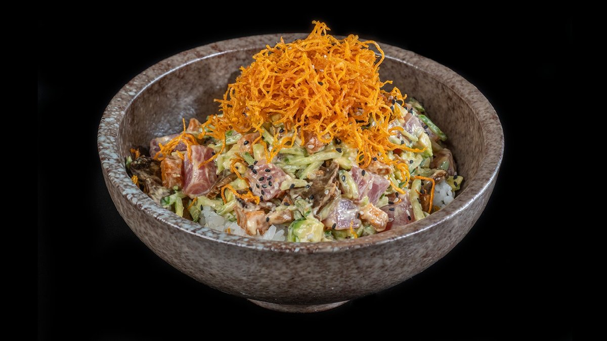 טרטר טונה, אבוקדו, מלפפון, בצל ירוק, פטריות שיטאקה, קוביות בטטה, על מצע אורז סושי. בליווי ספייסי מיונז וסויה, עם שבבי בטטה ושומשום מעל.