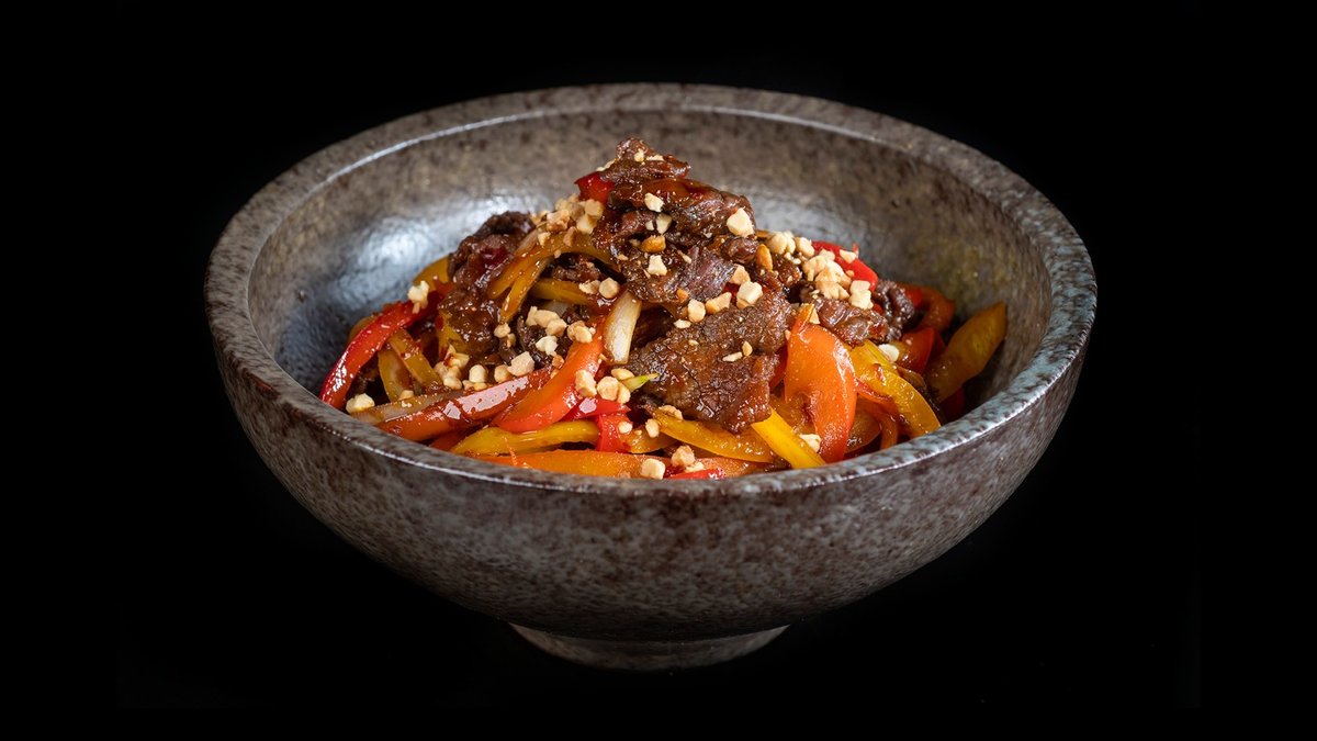בקר מוקפץ עם בצל לבן ופלפלים בשני צבעים. ברוטב סצ'ואן, על מצע אורז מאודה בעיטור בוטנים