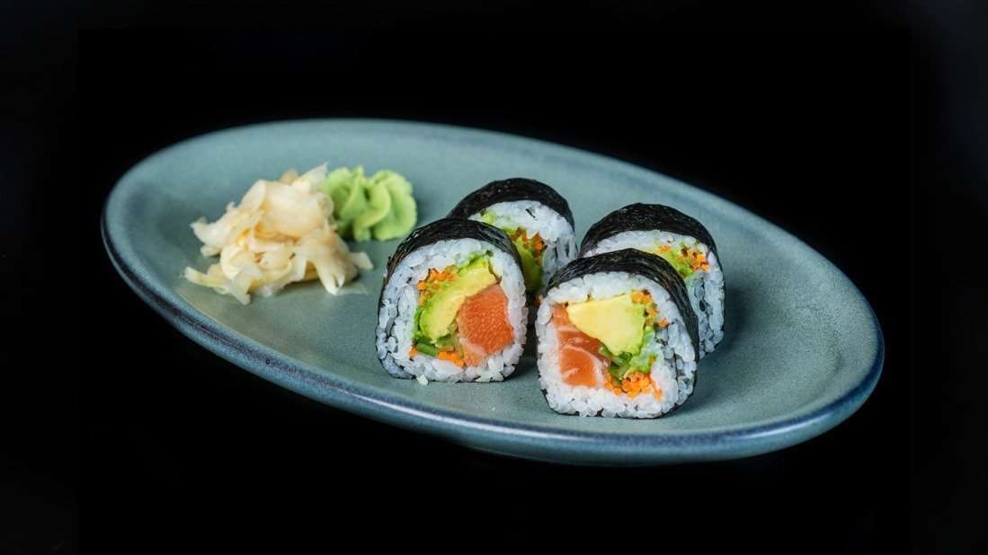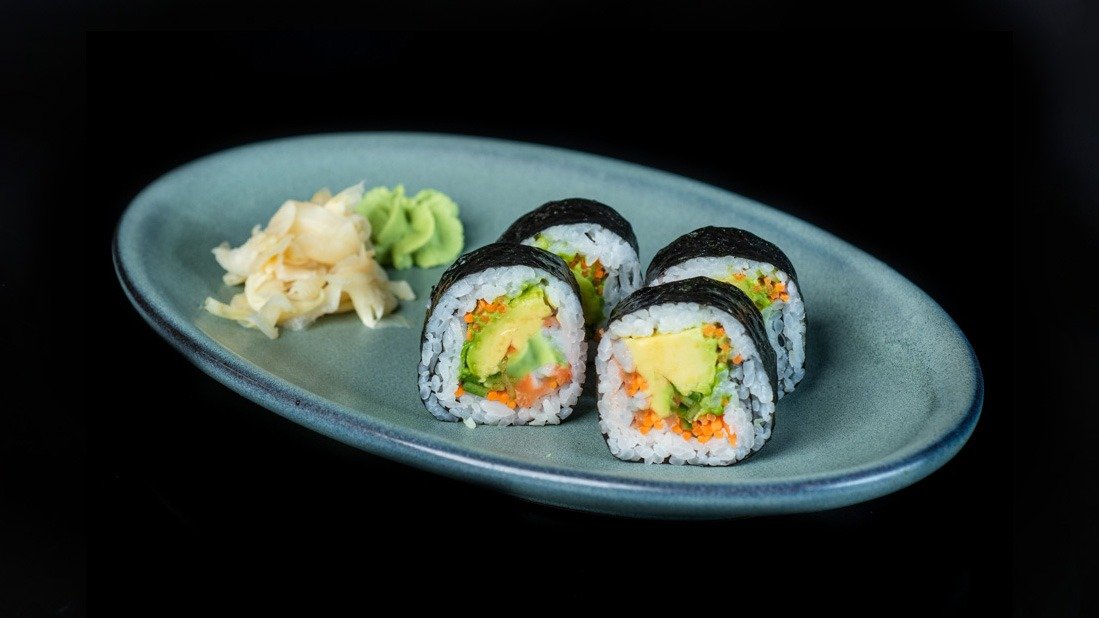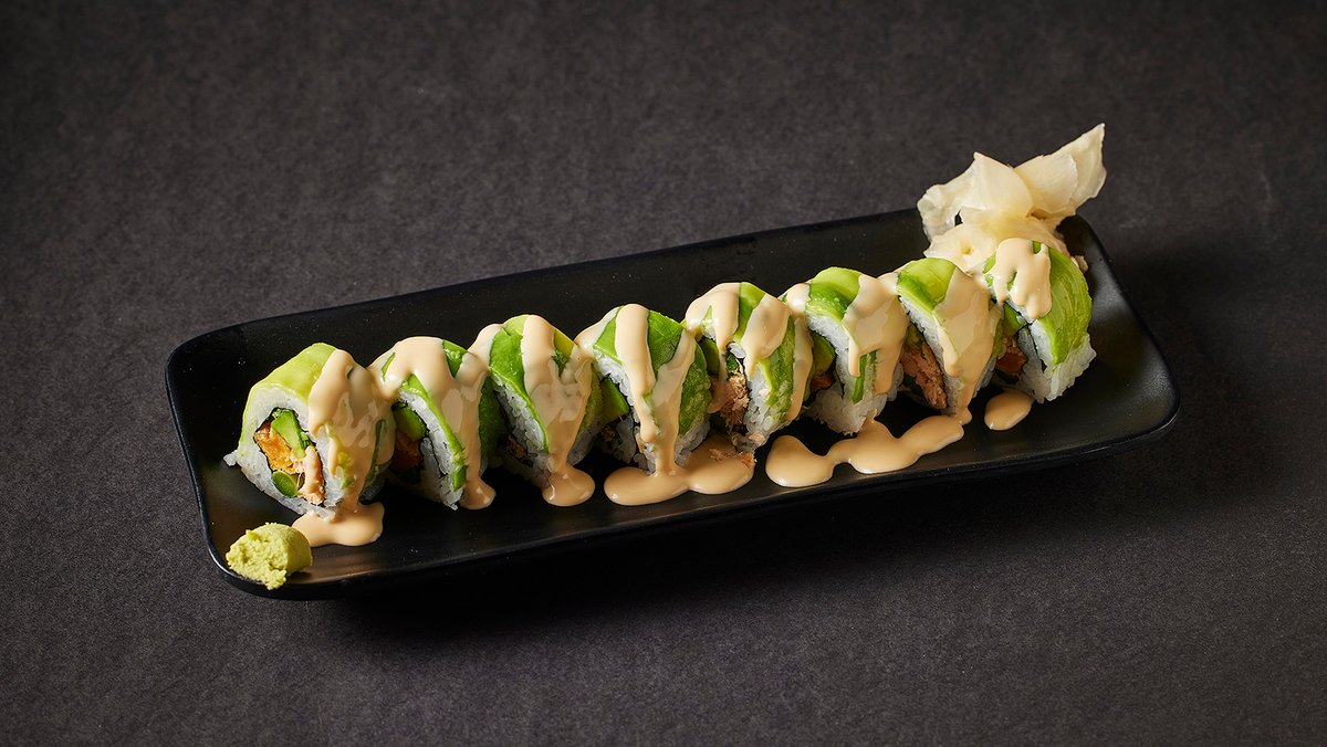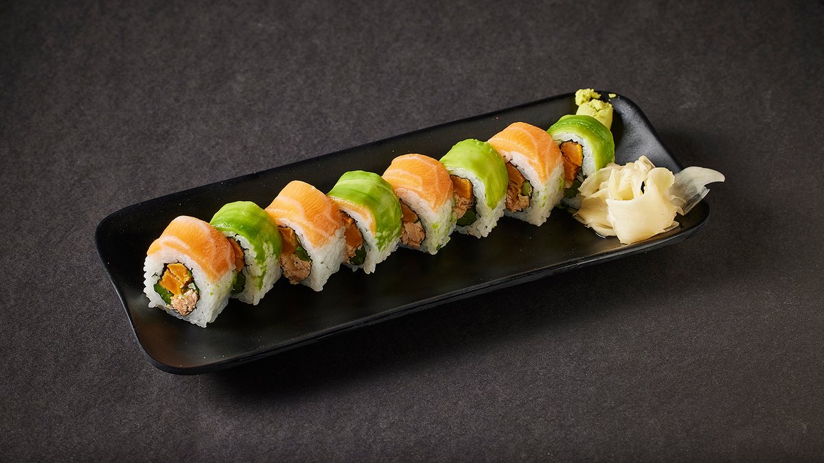 סלמון בטמפורה, אבוקדו, בצל ירוק ובטטה, במעטפת אבוקדו ונגיעות ספייסי מיונז