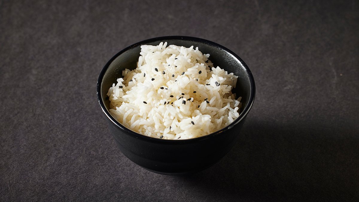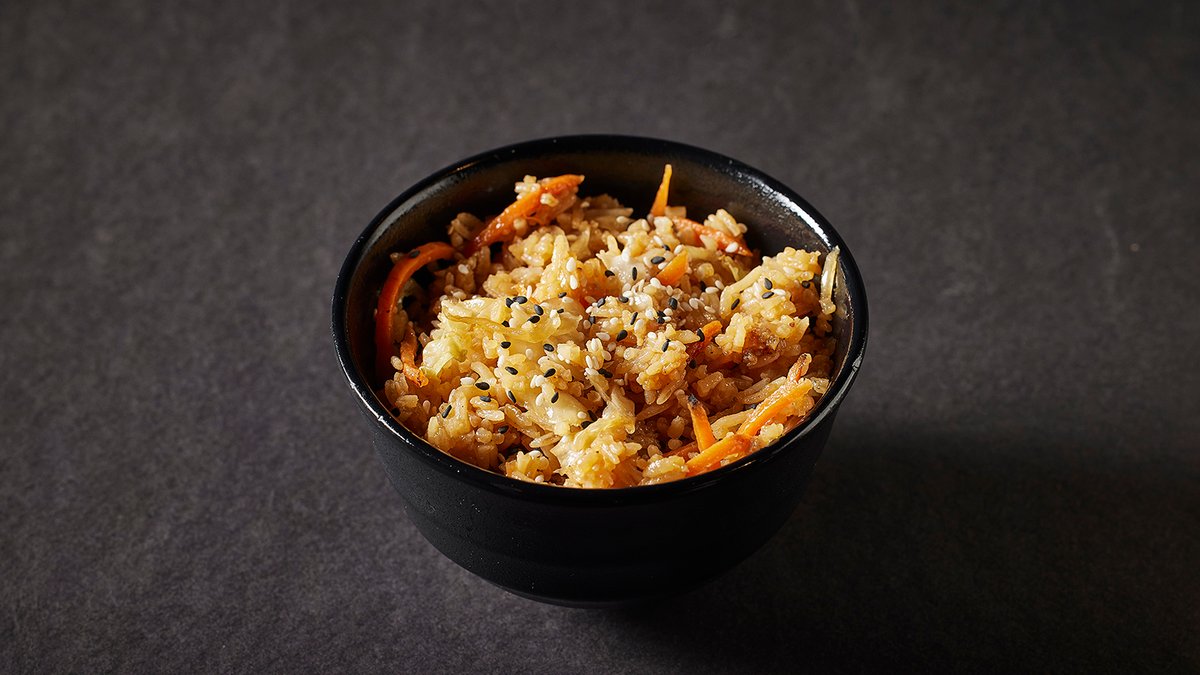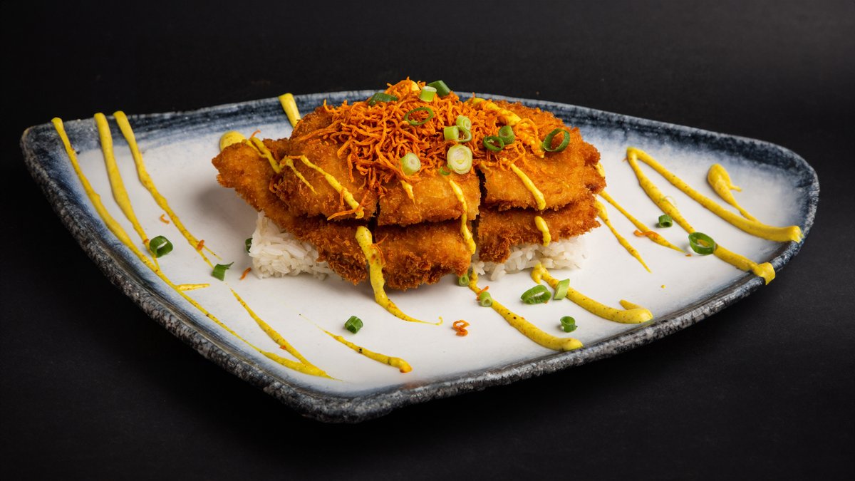 חזה עוף בציפוי פריך בעיטור איולי קארי ובצל ירוק על מצע אורז. מכיל מיונז
