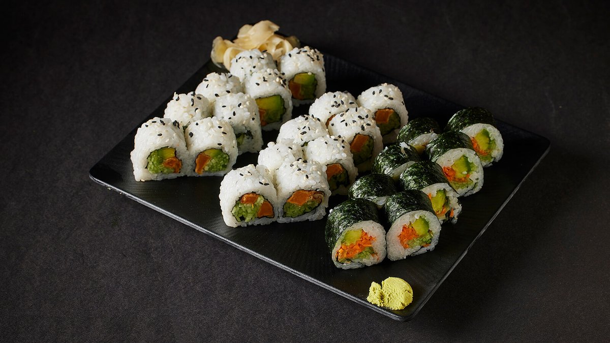 אבוקדו, מלפפון וגזר, עטוף בסלמון, טונה ודג לבן.