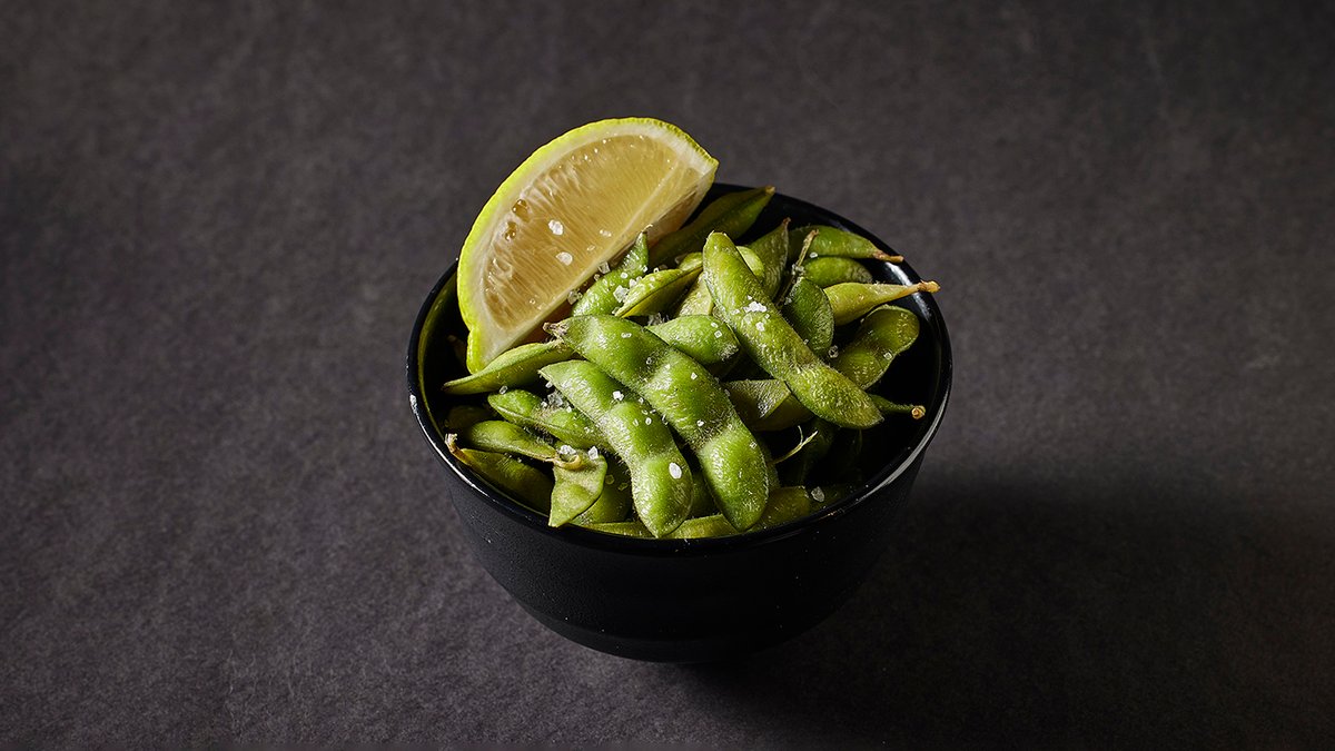 פולי סויה מבושלים. מוגש עם מלח גס ופלח לימון. טבעוני.