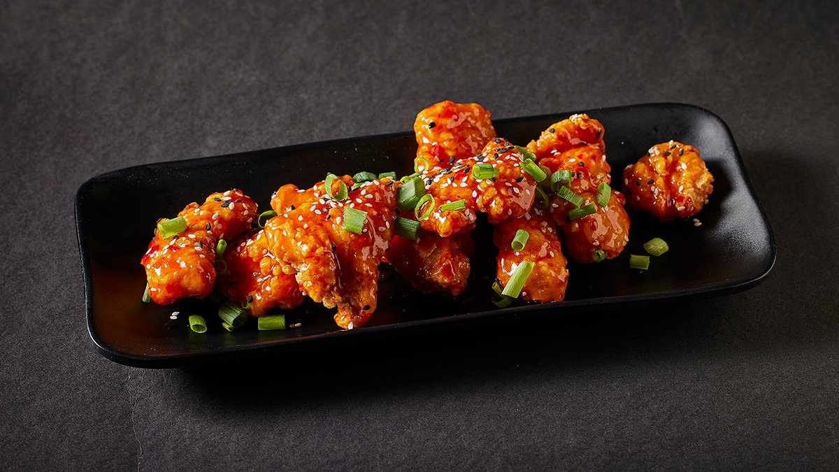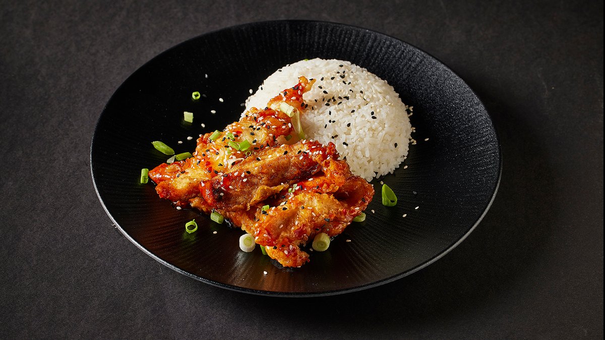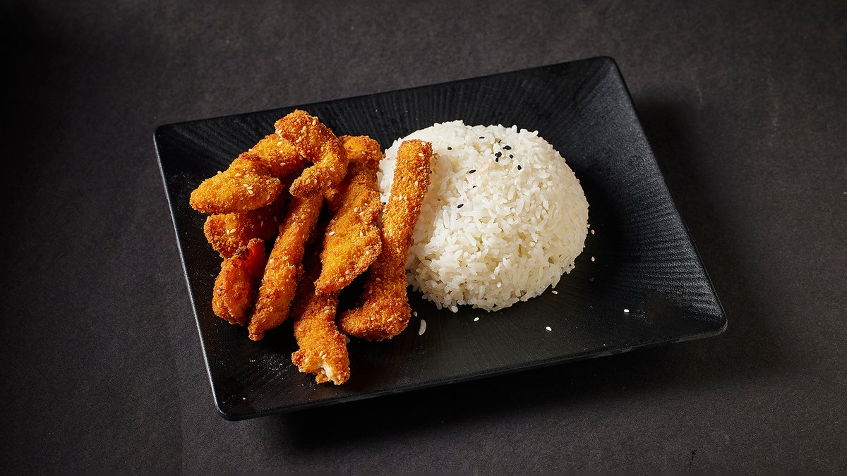 נתחי עוף בציפוי טמפורה, ברוטב צילי למון וסויה, בעיטור שומשום. מוגש בתוספת אורז / צ׳יפס לבחירה