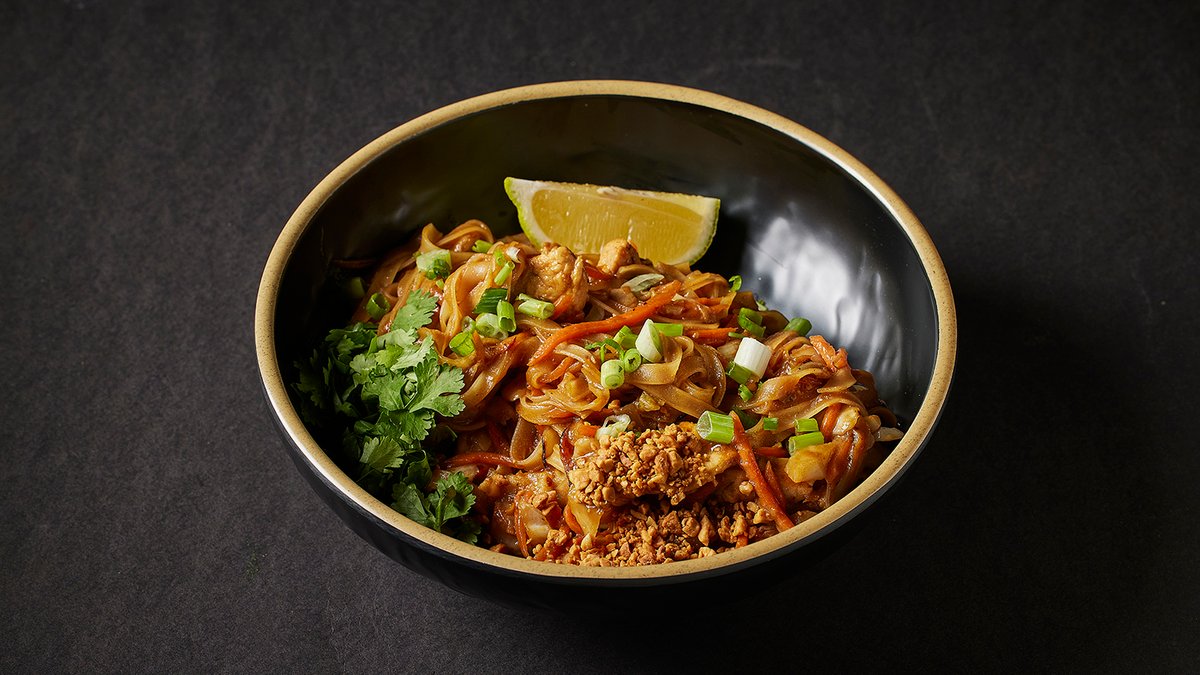 אטריות אורז מוקפצות עם טופו/עוף/בקר, גזר, כרוב, נבטים, נטפי ביצה ברוטב תאילנדי בעיטור בוטנים, בצל ירוק, כוסברה ולימון