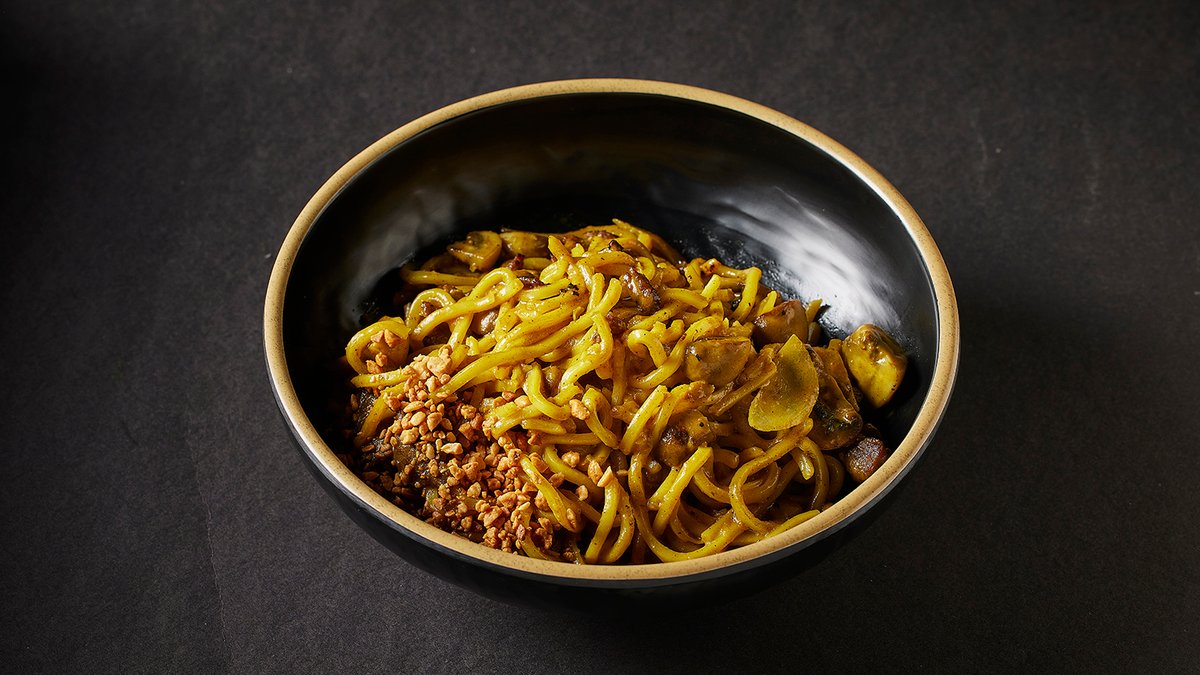 אטריות ביצים מוקפצות עם טופו/עוף/בקר, פטריות, בצל לבן וירוק ברוטב קארי צהוב, קוקוס וחמאת בוטנים בעיטור בוטנים