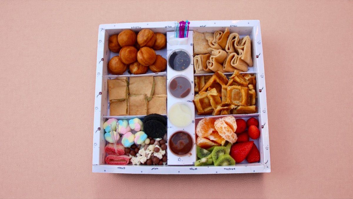 10 פשאפיש, וופל בלגי חתוך, קרפ חתוך, מיני קרפ דובאי, מבחר פירות העונה ומיקס תוספות מוגש עם שוקולד לבחירה ומייפל