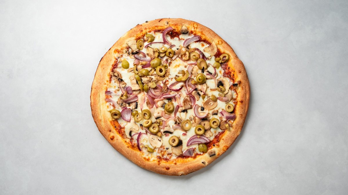 מוצרלה, רוטב עגבניות, פטריות, בצל סגול וזיתים ירוקים