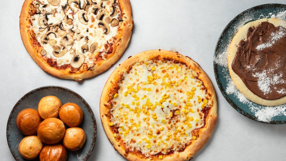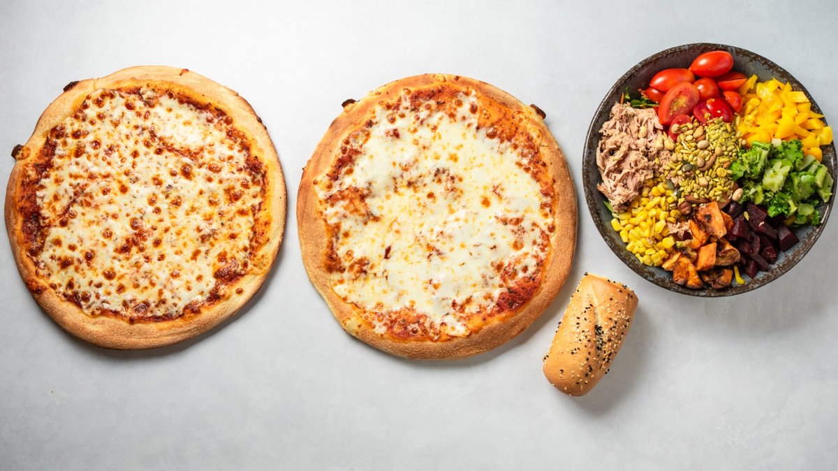 מוצרלה, רוטב עגבניות, בצל סגול, עגבניות חתוכות, זיתי קלמנטה, גבינה בולגרית ואורגנו