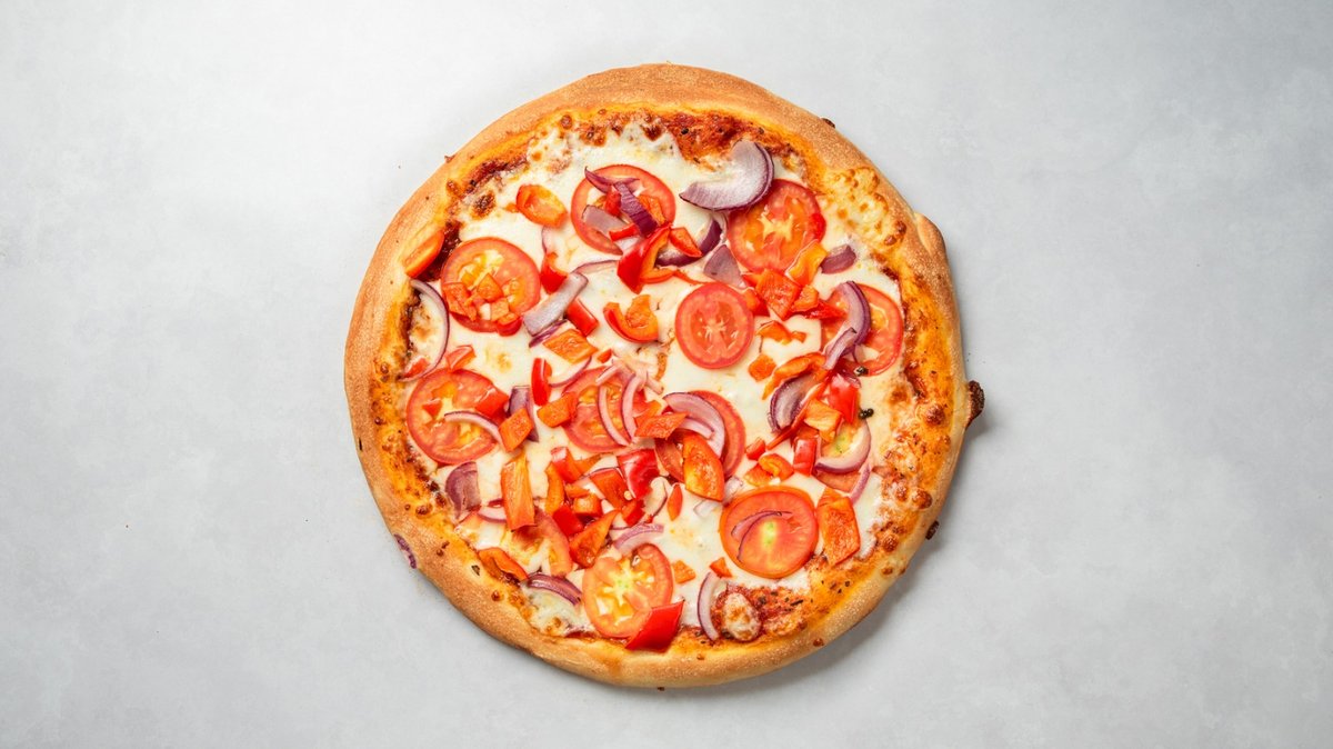רוטב עגבניות, גבינת מוצרלה, עגבנייה, בצל סגול ופלפל גמבה