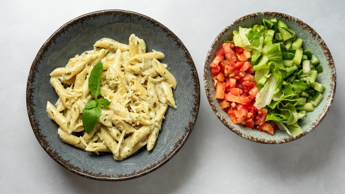 פסטה פוזילי ברוטב לבחירה מוגש לצד פרמזן מגורד