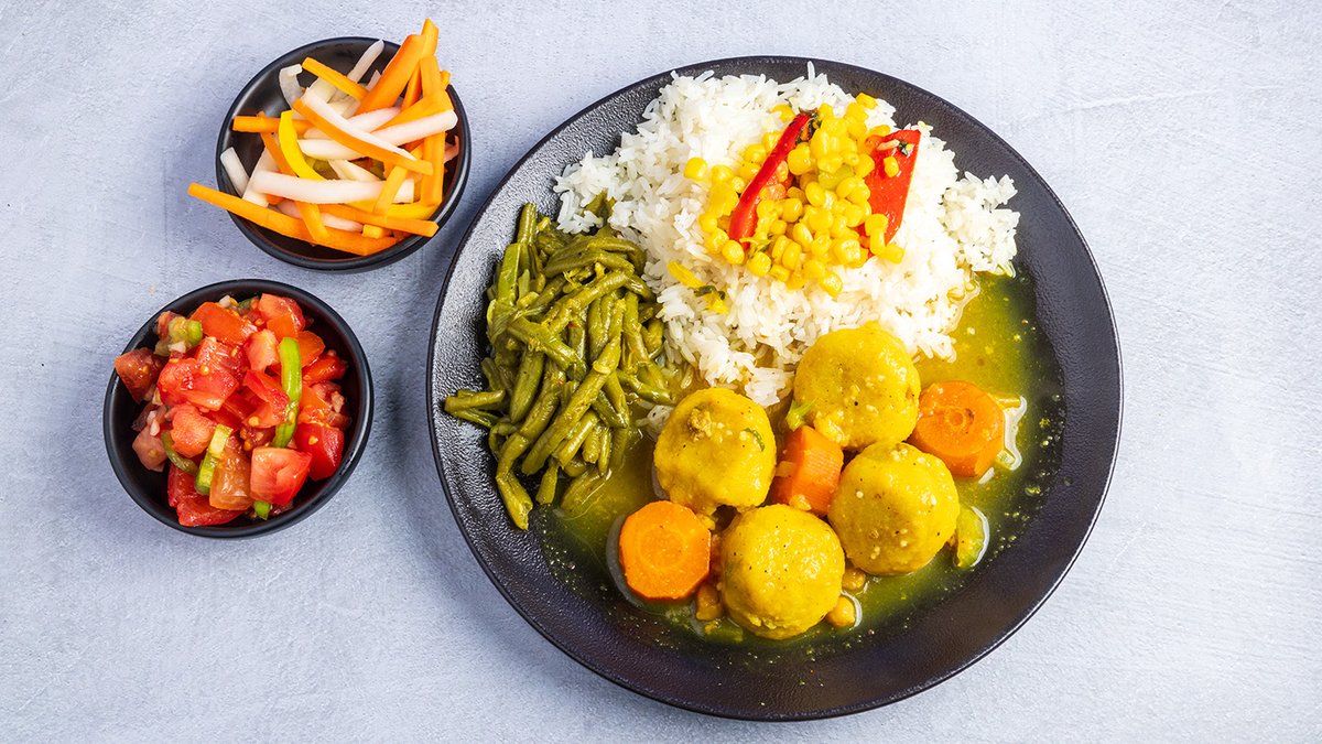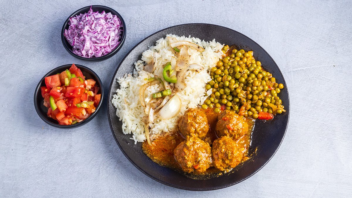 קציצות עוף ברוטב צהוב, ממרחים וסלטים לבחירה
