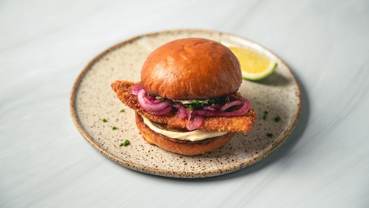 קריספי פיש בלחמניית בריוש דלעת, עם מיונז יפני, בצל סומק מוחמץ ועירית