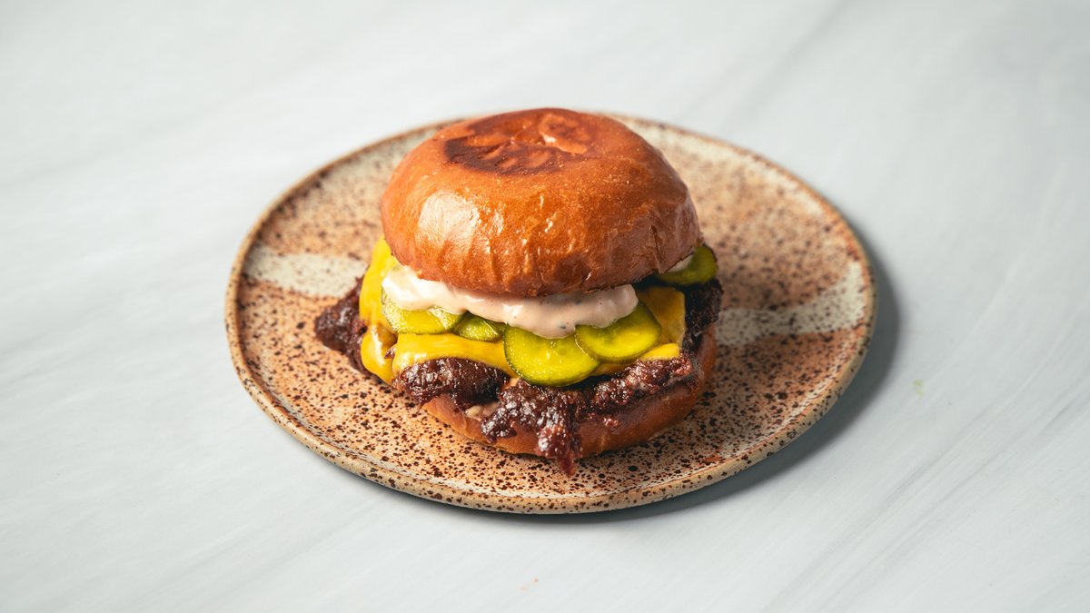 דאבל צ'יזבורגר בלחמניית בריוש דלעת עם רוטב קלאסי, צ'דר חמוצים ובצל