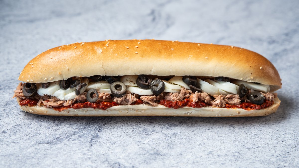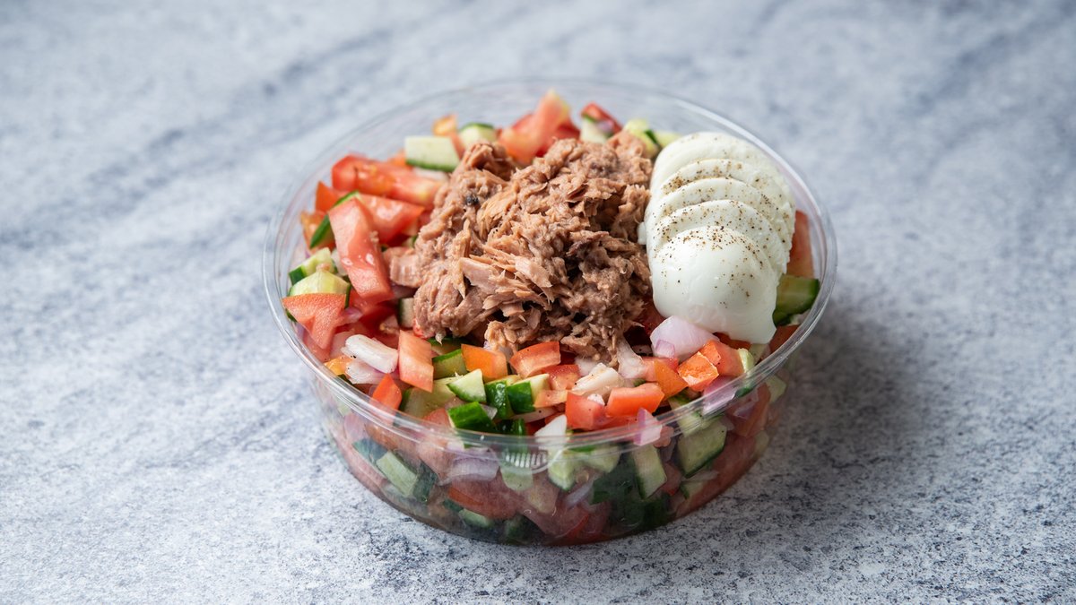 חסה, מלפפון, עגבניה, בצל סגול, טונה, ביצה קשה וזיתים שחורים