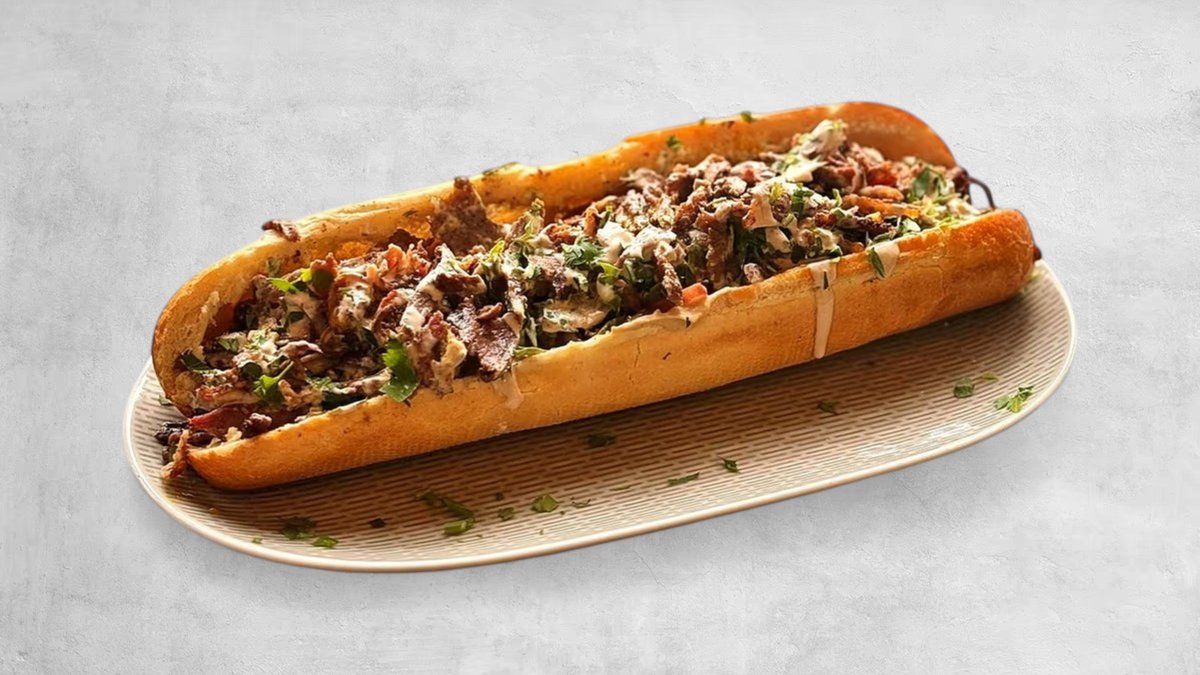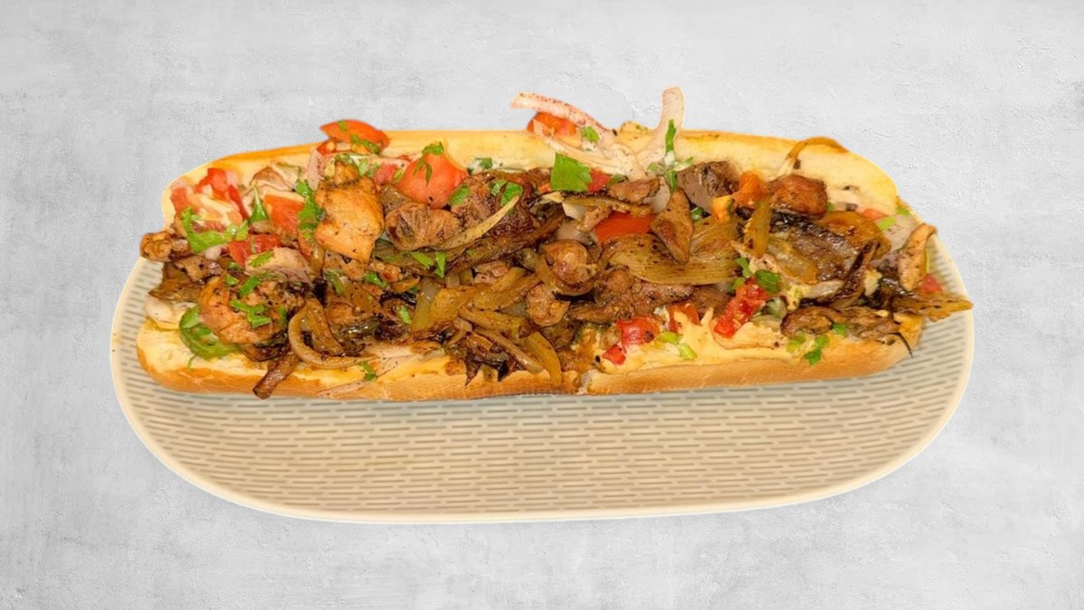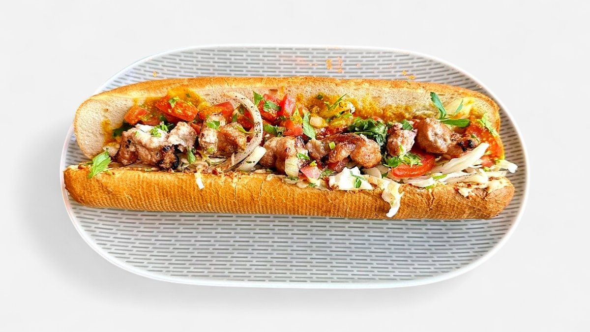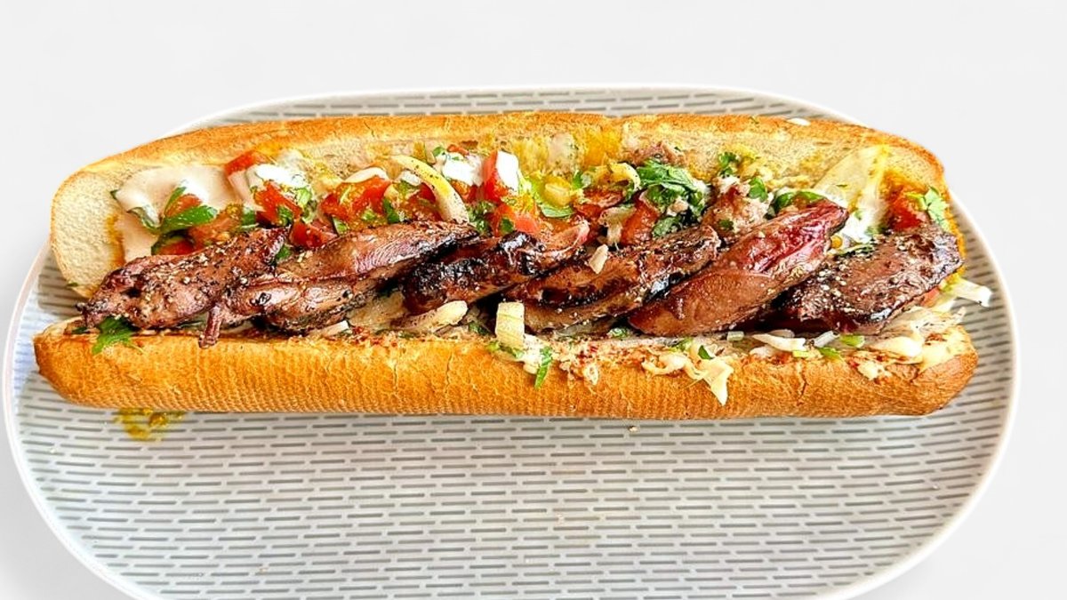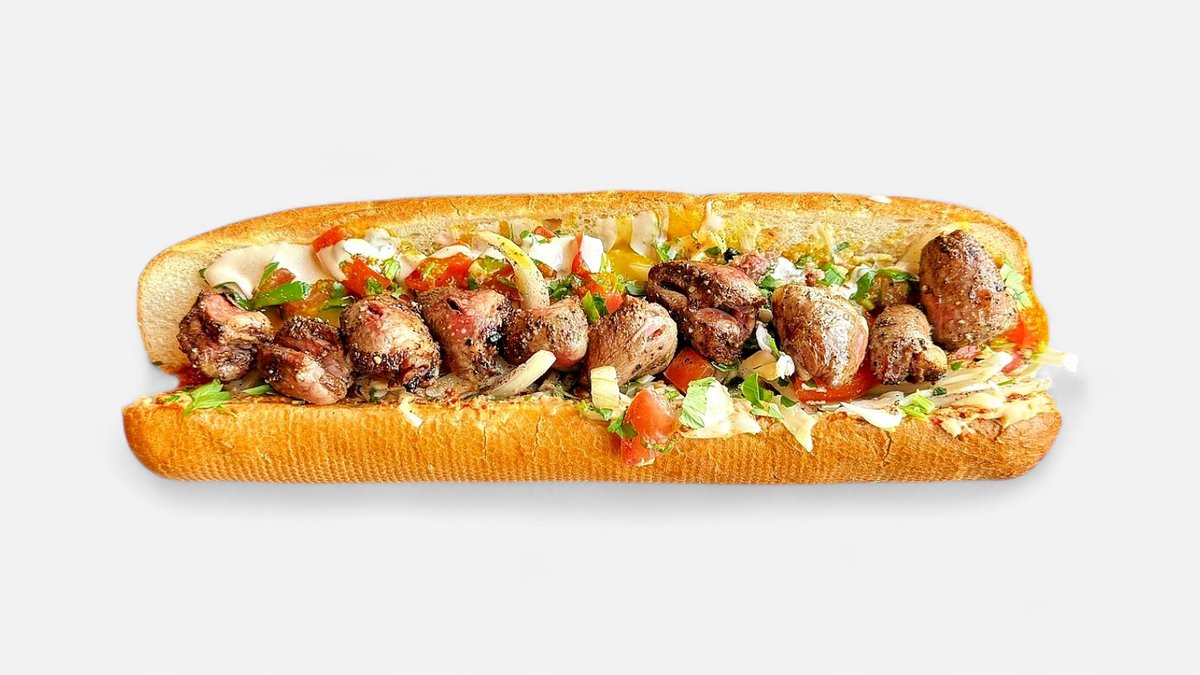 מוגש עם 3 סלטים, חמוצים, חומוס, פיתה, טחינה ועמבה