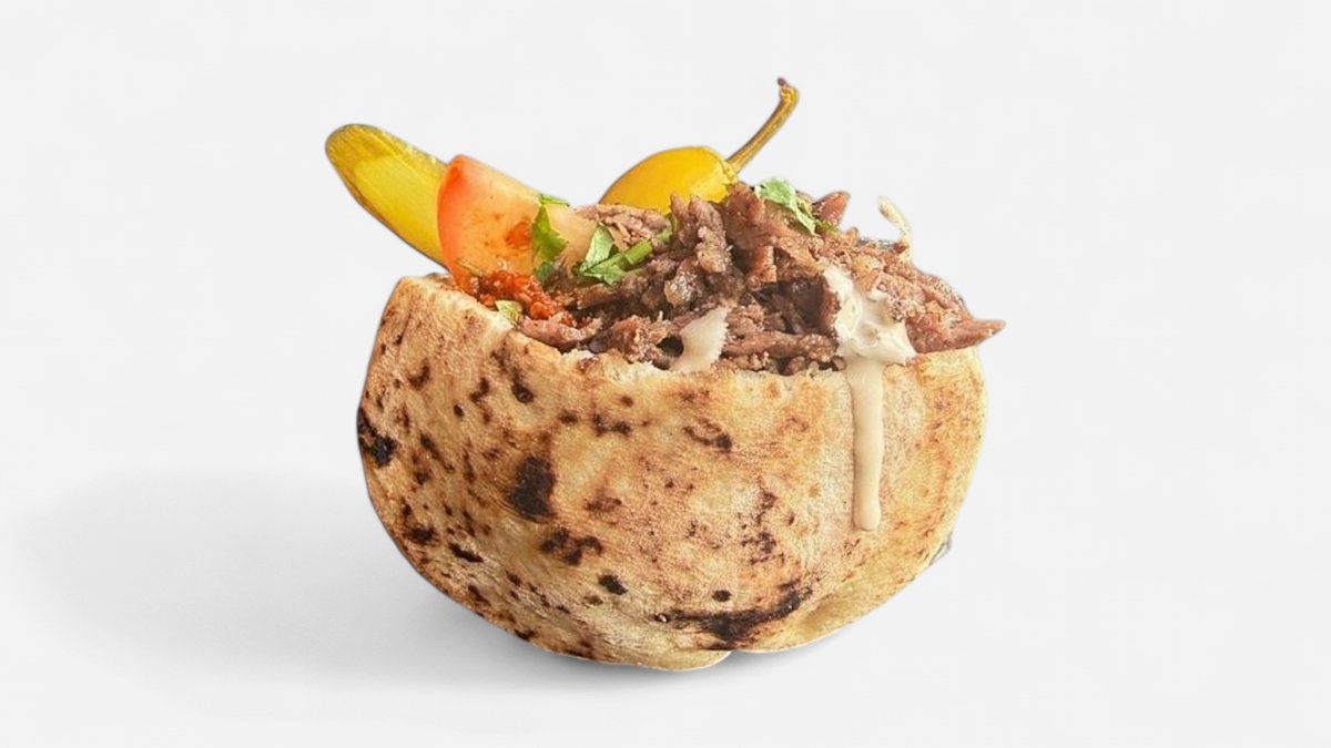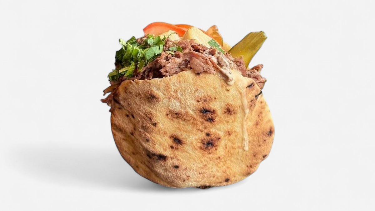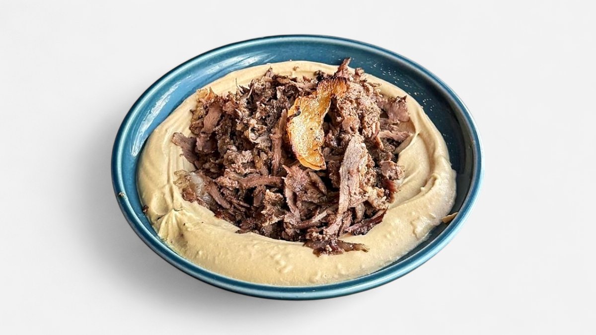חומוס עם שווארמה, מוגש עם 2 פיתות וחמוצים