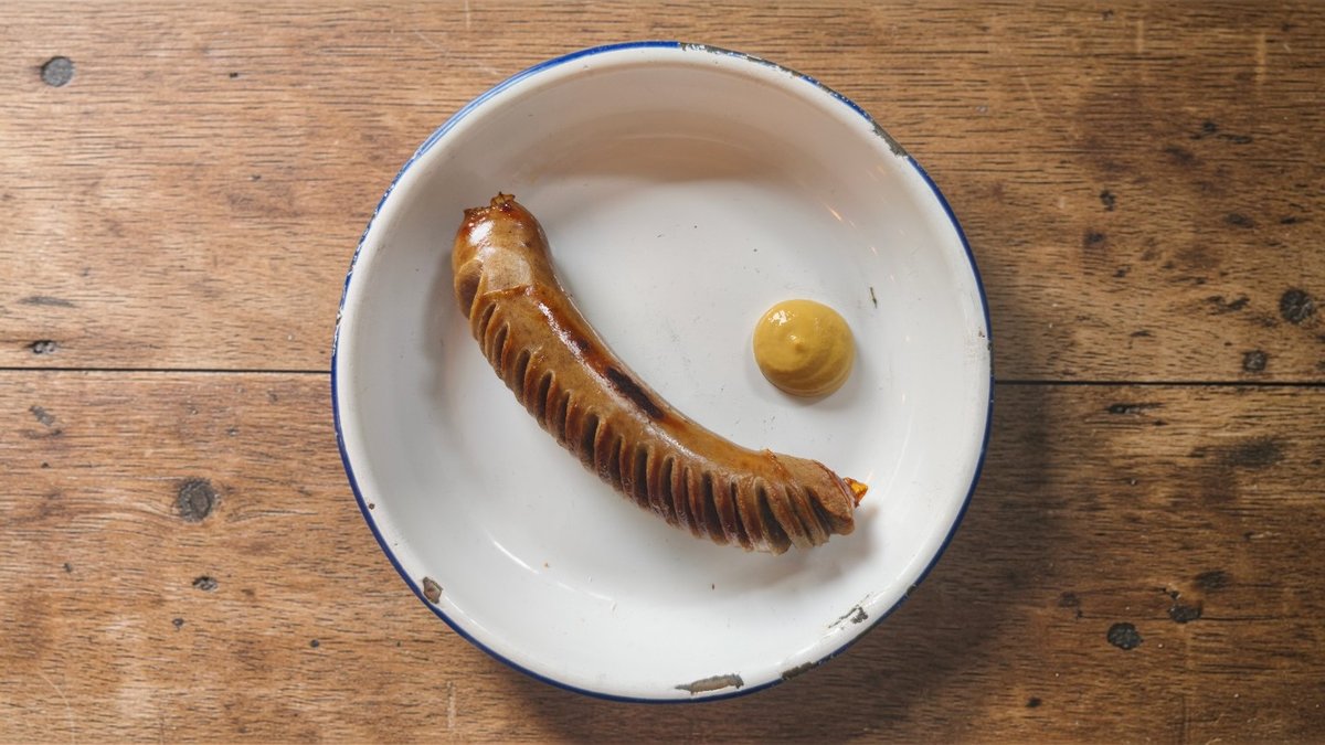 נקניקיית חזיר שמנמנה תבשיל כרוב כבוש, בייקון, נקניק חזיר ותפוחים מבושלים בבירה, תוספת לבחירה
