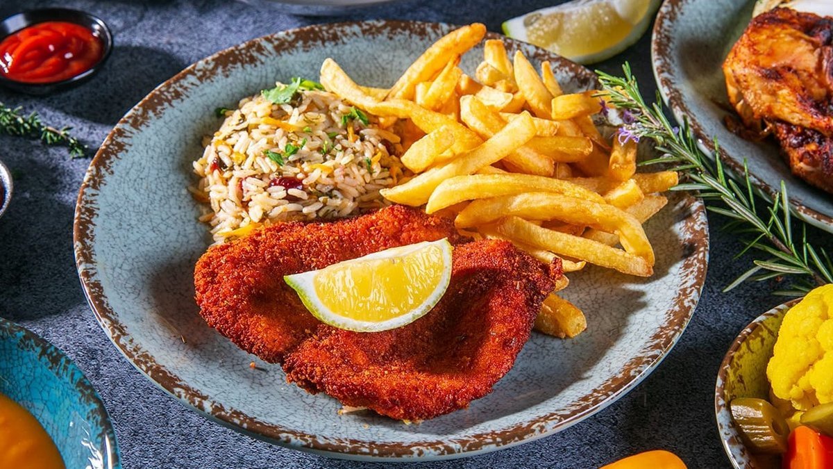 בחרו סוג שניצל, צורת הגשה, סלטים וממרחים | מוגש עם צ׳יפס ושתיה לבחירה