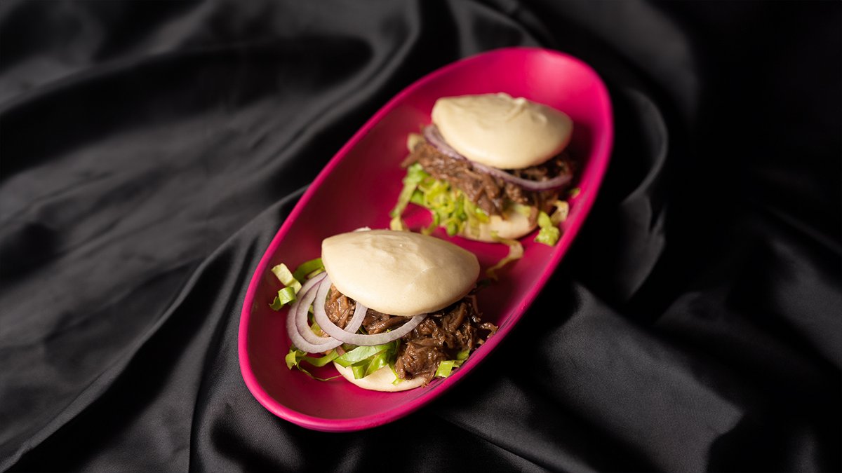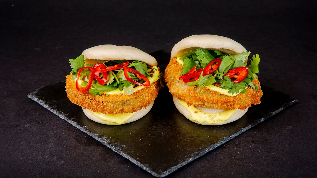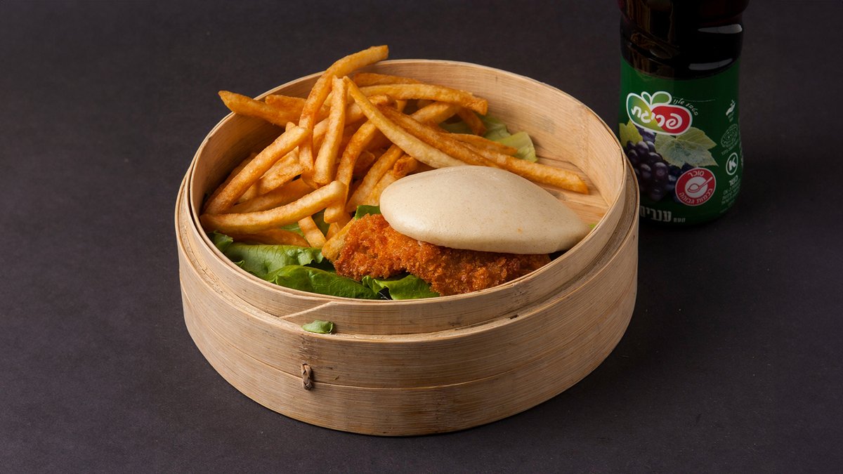 לחמניית באו, שניצל, חסה ורוטב יוזו מוגש עם שתייה קלה לבחירה