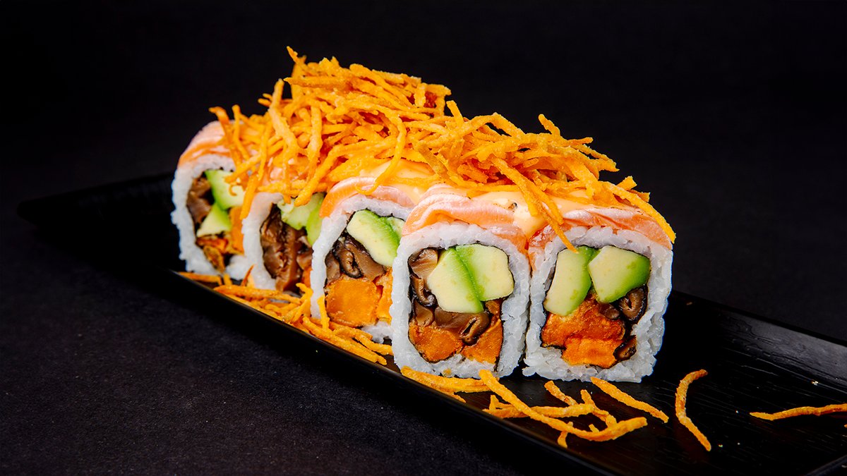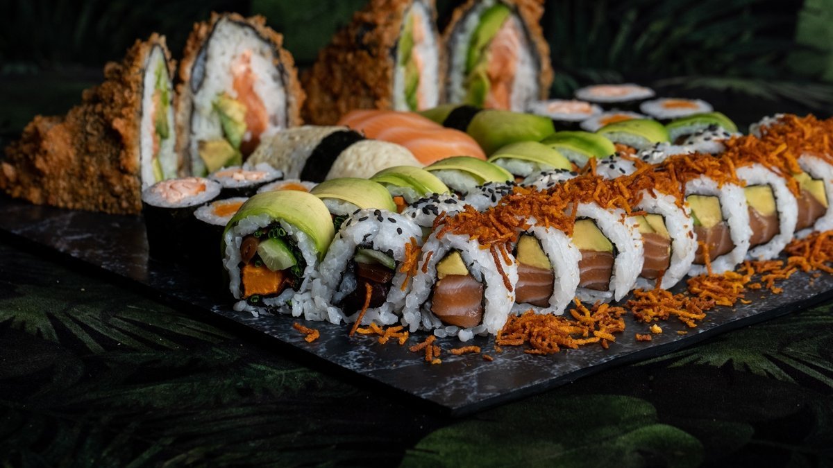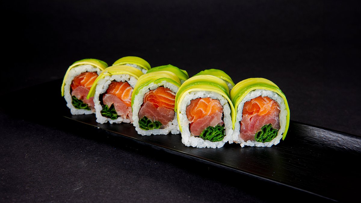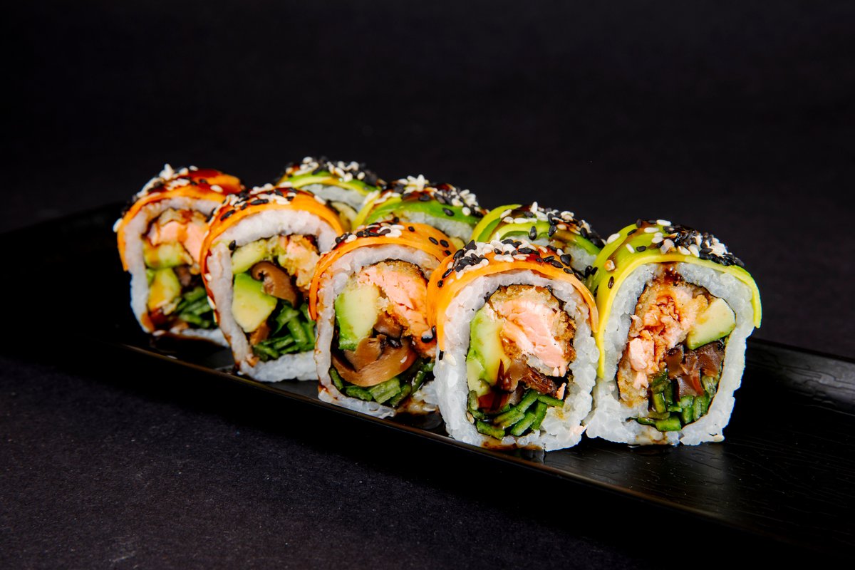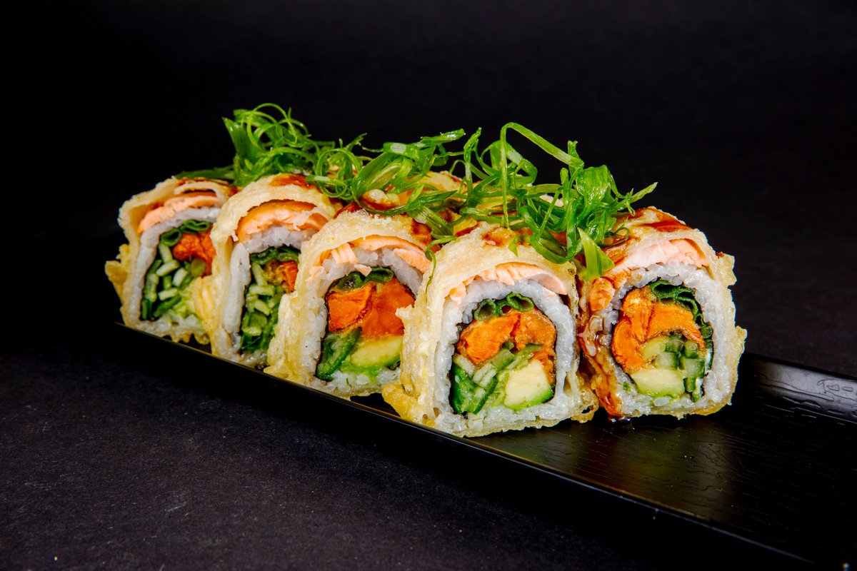 סלמון בטמפורה, אבוקדו, מלפפון ושיטאקה במעטפת אבוקדו, בטטה, טריאקי ושומשום