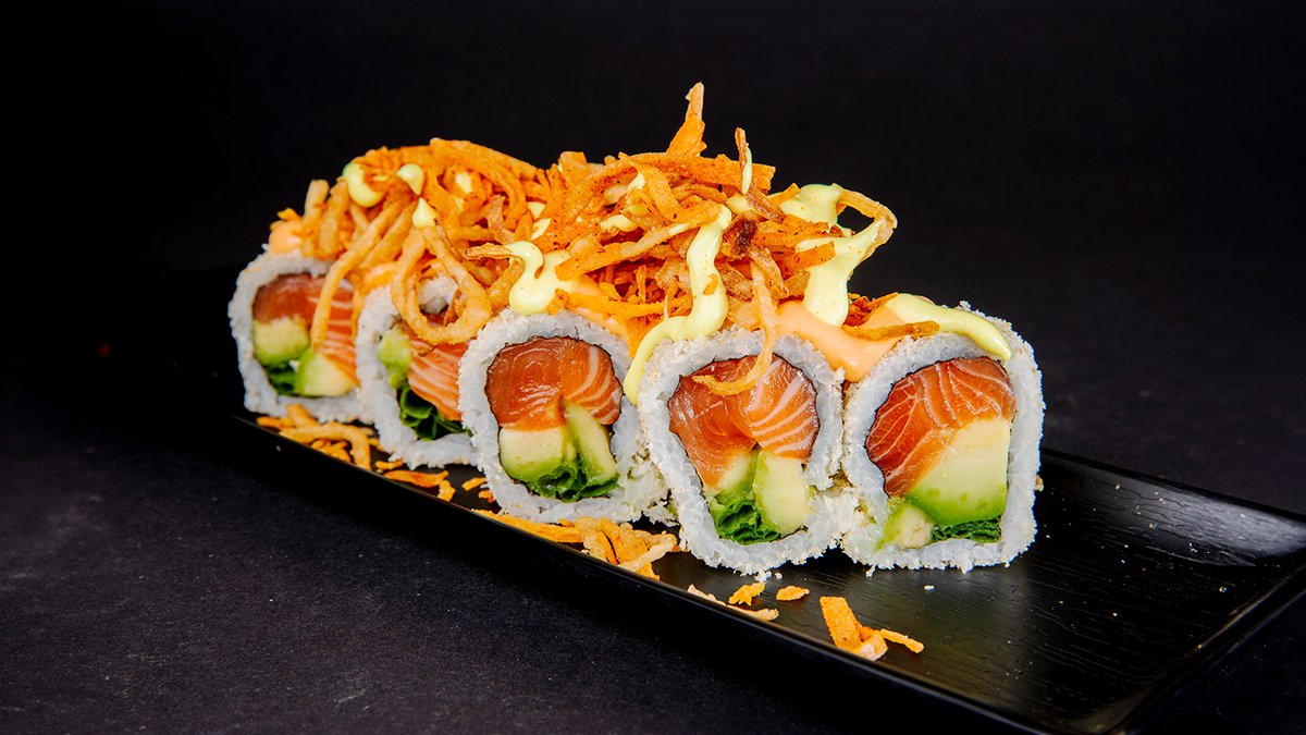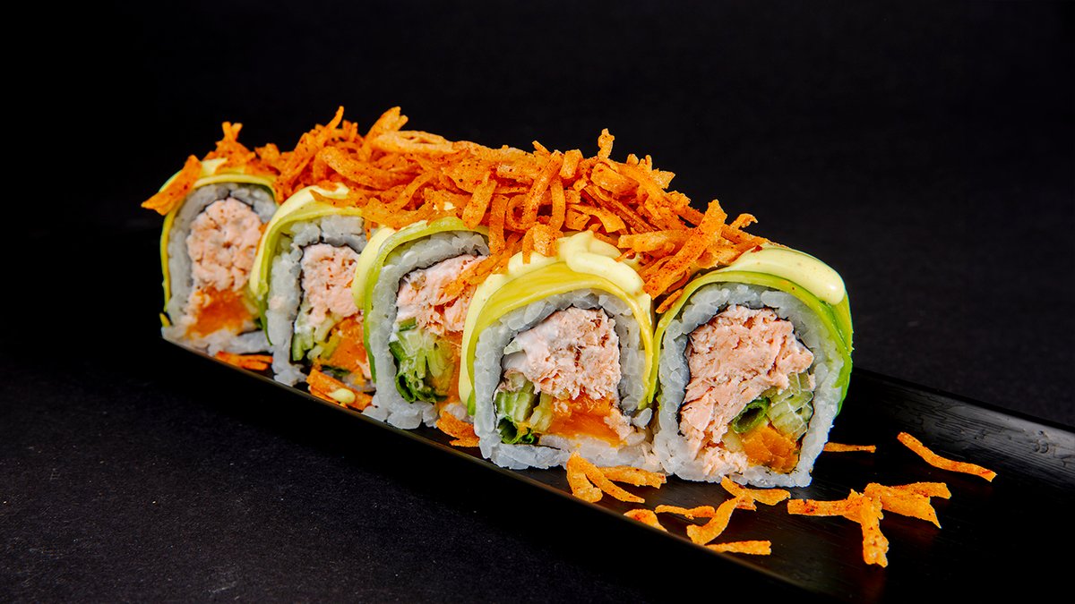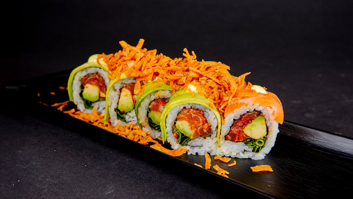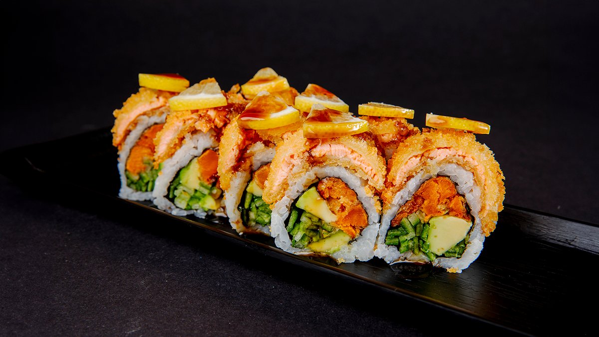 אבוקדו, בטטה בטמפורה ומלפפון במעטפת סלמון קראנץ׳, לימון וטריאקי