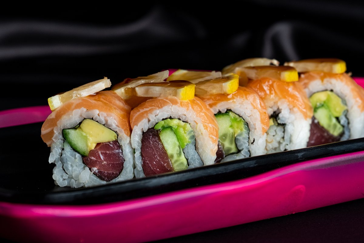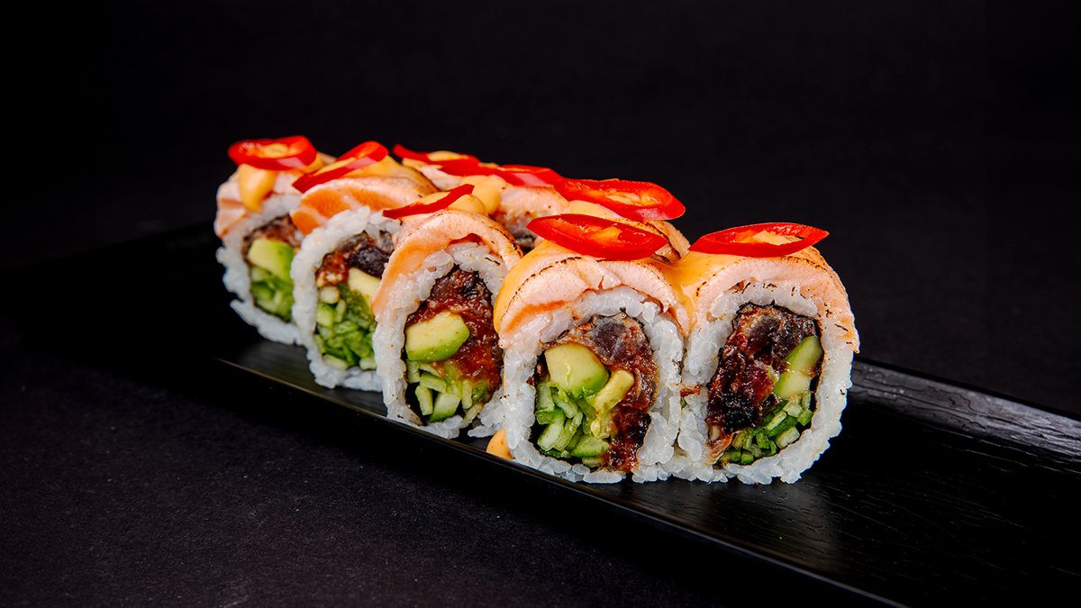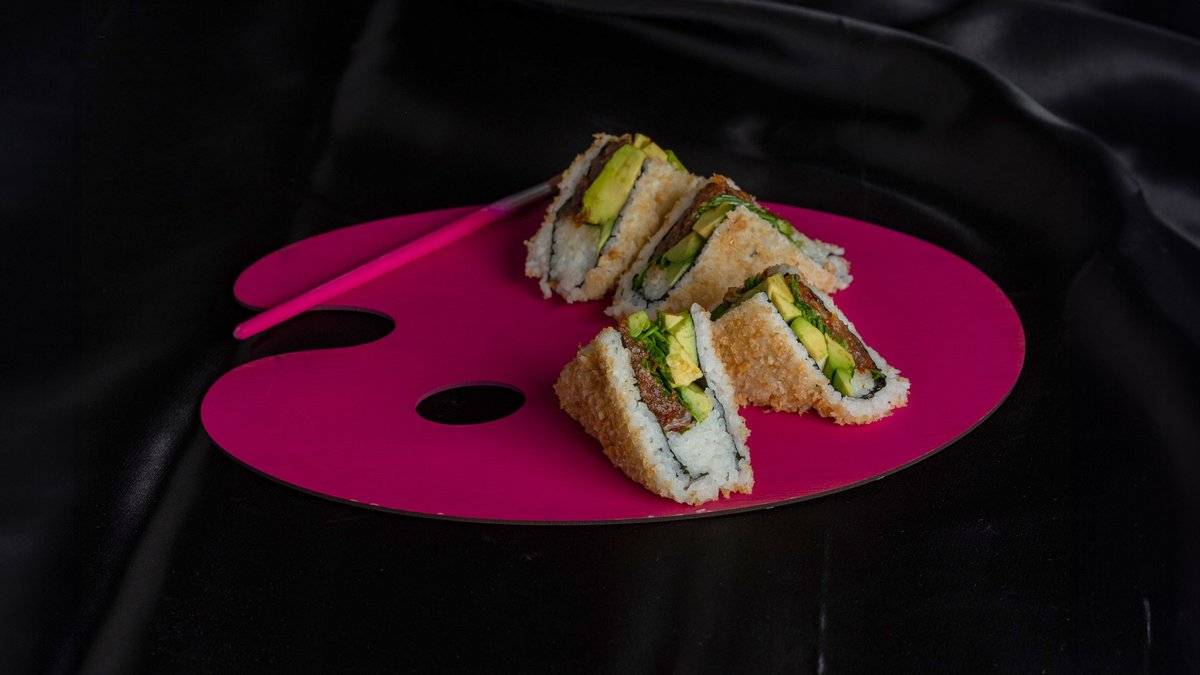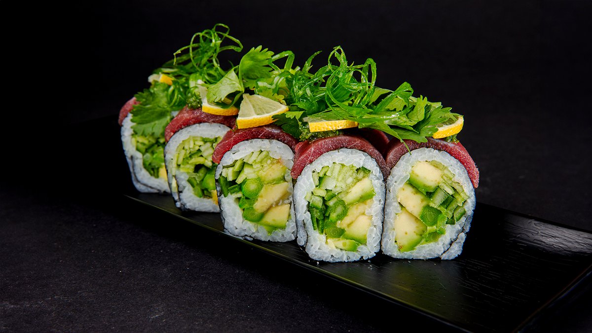 אבוקדו, בטטה בטמפורה ומלפפון במעטפת סלמון קראנץ׳, לימון וטריאקי