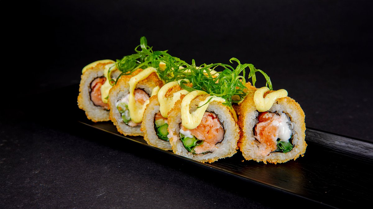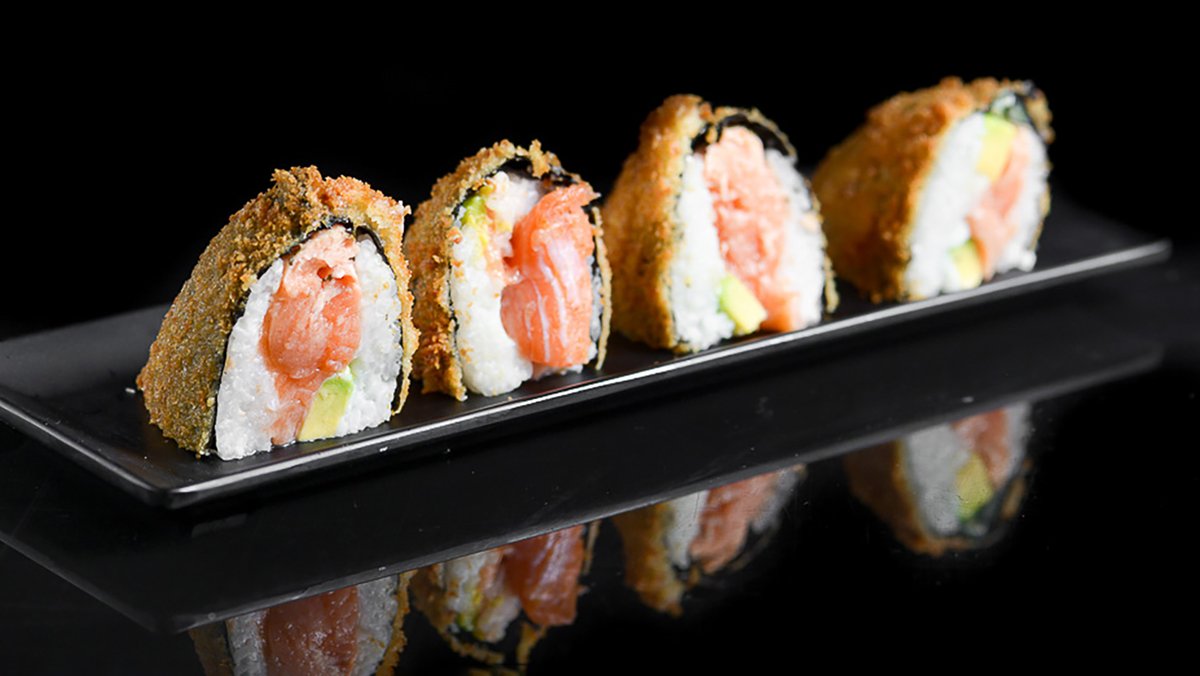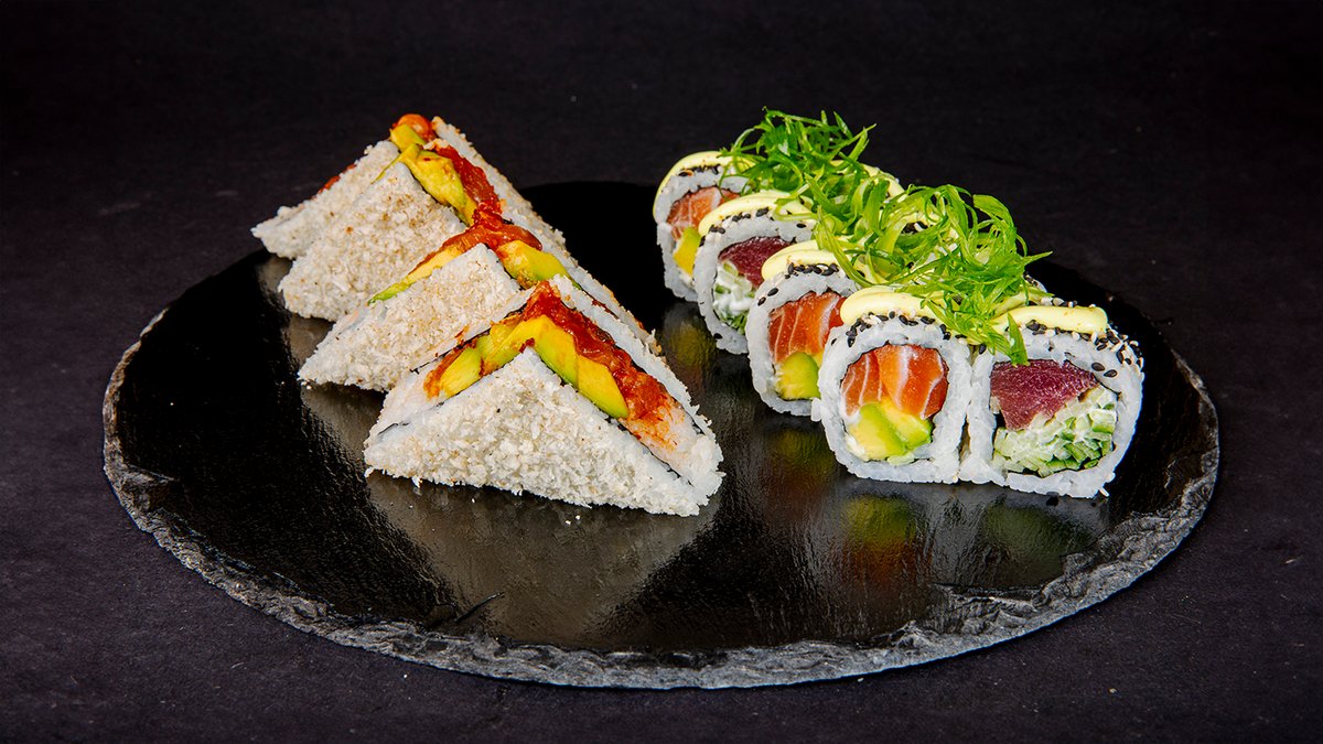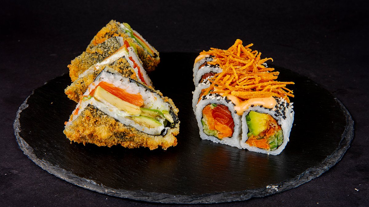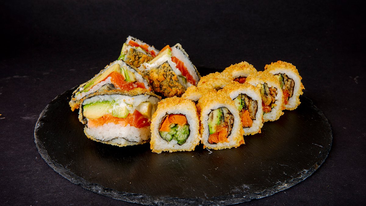 שרימפס בטמפורה אבוקדו ופנקו 4 יח׳, בטטה בטמפורה, מלפפון ועירית בטמפורה ופנקו 4 יח׳, סושי סנדוויץ בטמפורה ופנקו עם סלמון, אבוקדו וגבינת שמנת 4 יח׳