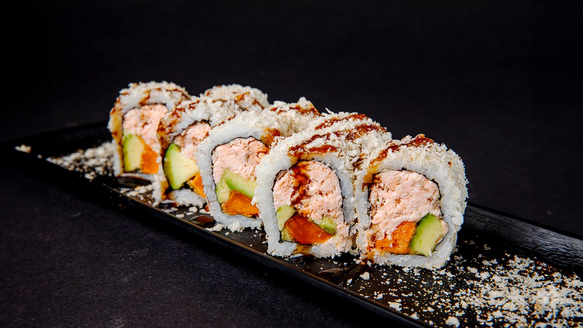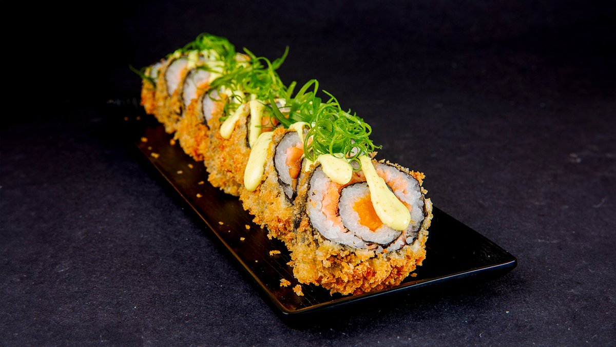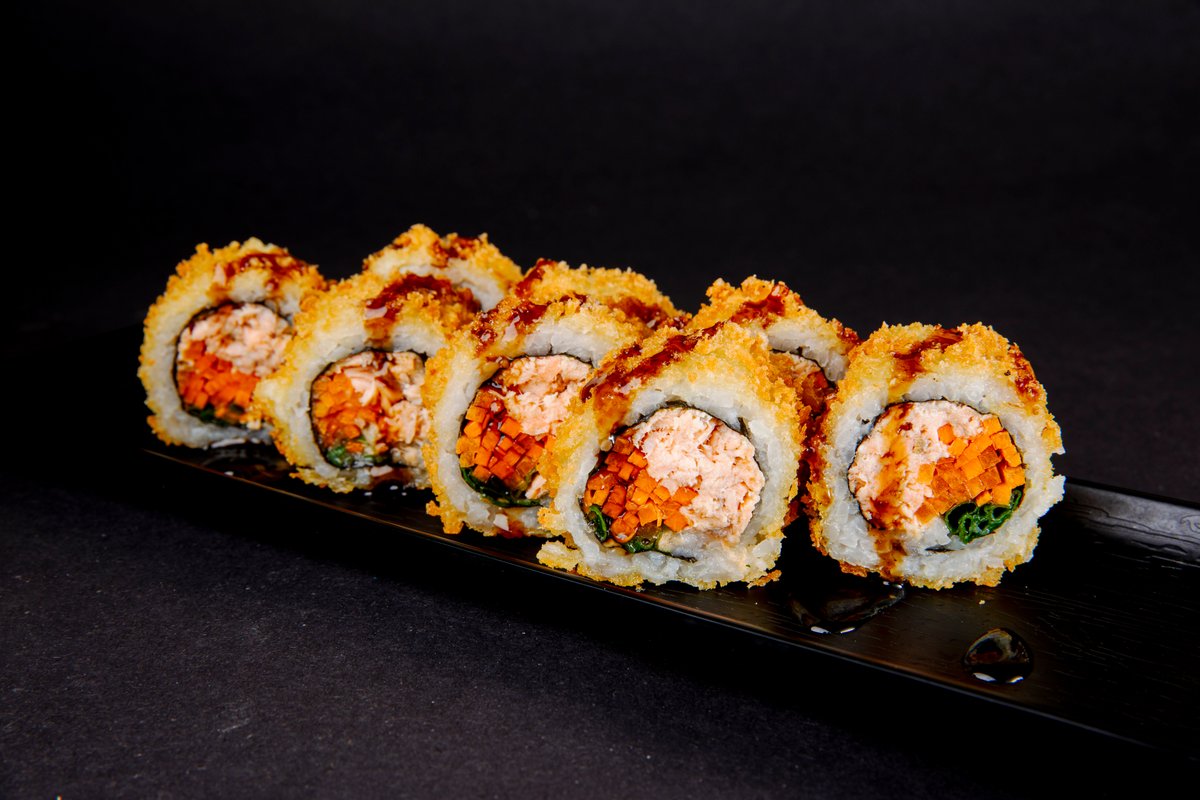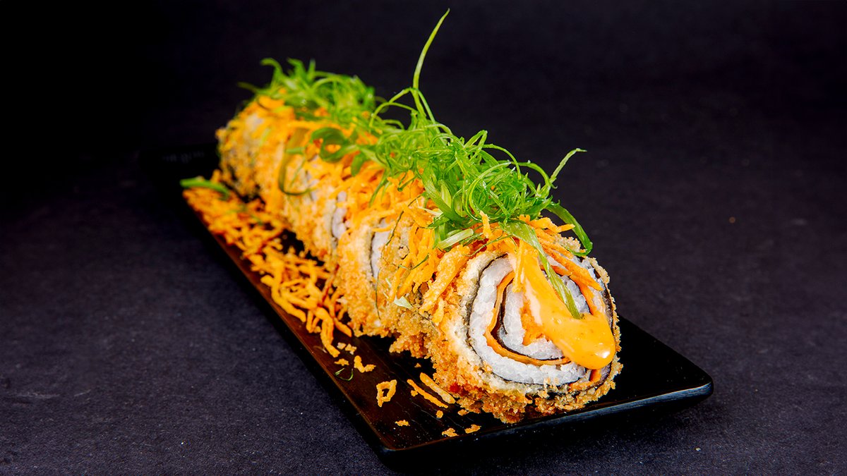 רול חם בטמפורה ופנקו עם סלמון צלוי, גזר, טריאקי ועירית