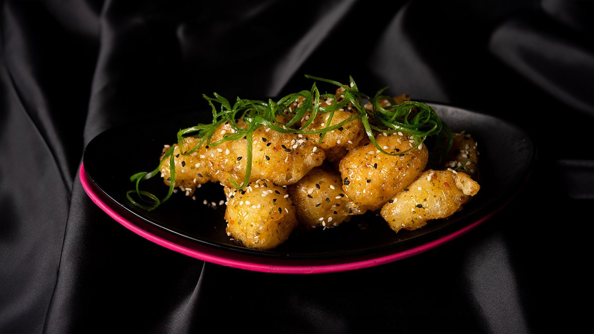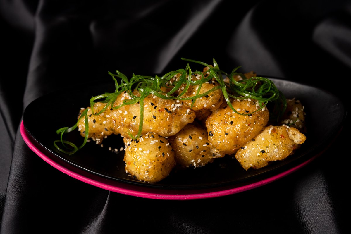 נתחים של חזה עוף בטמפורה ברוטב צ‘ילי-נענע, עלי בזיליקום ושומשום