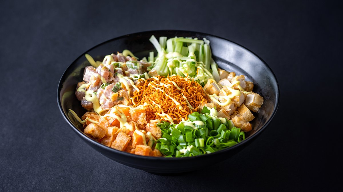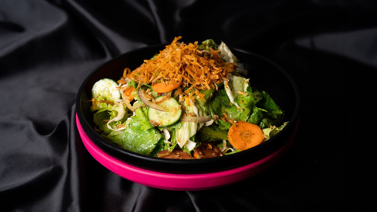 חסה, בצל ירוק, עגבניות שרי, מלפפון, גזר, כרוב ונבטים, בוויניגרט צ‘ילי שומשום, אצה קראנץ׳ ובצל פריך