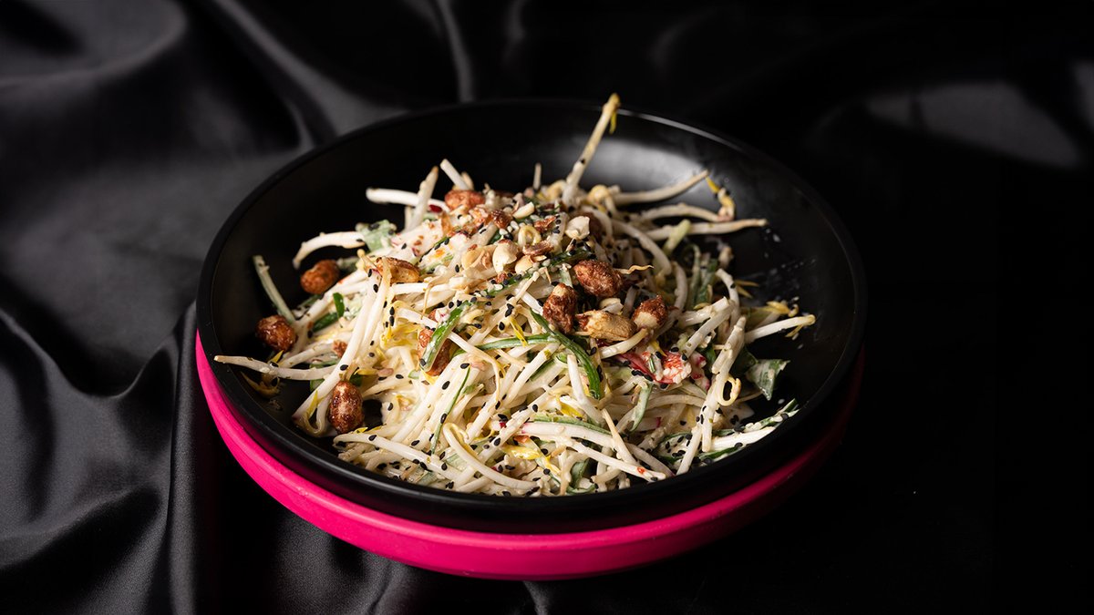 נבטים, מלפפון, צנון, בצל ירוק, גינג‘ר, פלפל צ‘ילי, שומשום ובוטנים מקורמלים באיולי צ‘ילי נענע