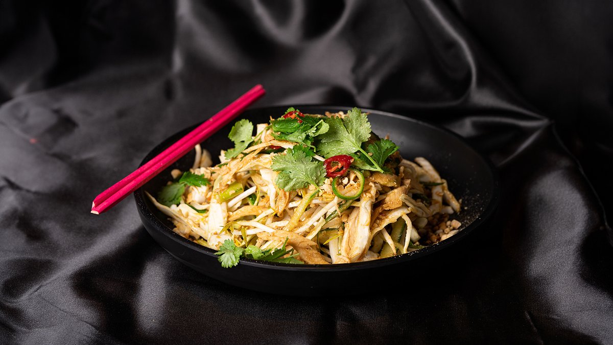 רצועות חזה עוף, מלפפון, נבטים, כרוב, בצל ירוק, כוסברה, פלפל צ‘ילי ובוטנים ברוטב הויסין מתקתק. מוגש קר