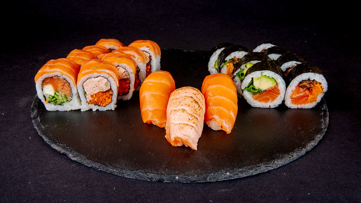 פוטומאקי סלמון, אבוקדו ועירית 4 יח׳, פוטומאקי סלמון, בטטה בטמפורה ושיטאקה 4 יח׳, אינסיידאאוט סלמון צלוי, קנפיו וגזר במעטפת סלמון 4 יח׳, אינסייד אאוט סלמון מעושן, מלפפון וטמגו במעטפת סלמון 4 יח׳, ניגירי סלמון 2 יח׳, ניגירי סלמון צרוב 1 יח׳