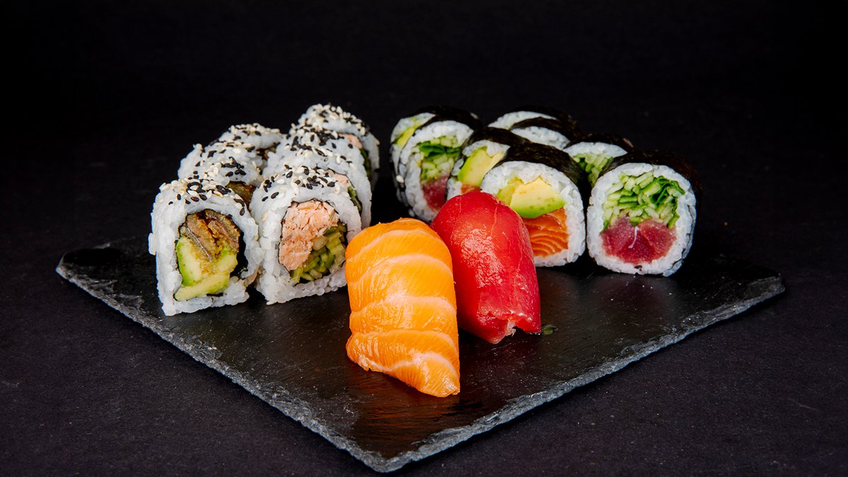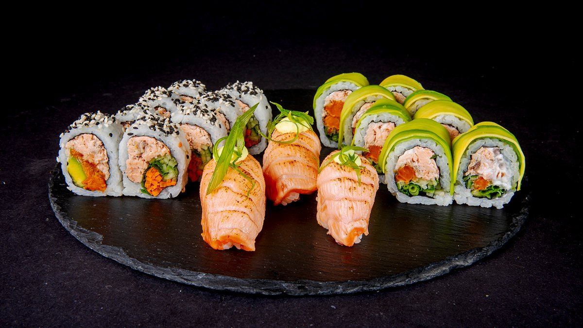 אינסיידאאוט סלמון, אבוקדו, גבינת שמנת , שומשום, רוטב יוזו ובצל ירוק 4 יח׳, אינסיידאאוט שרימפס, מלפפון וגבינת שמנת עם שומשום, רוטב יוזו ובצל ירוק 4 יח׳, ניגירי סלמון 1 יח׳, ניגירי אבוקדו 1 יח׳, סנדוויץ׳ ספייסי סלמון ואבוקדו בציפוי פנקו 4 יח׳