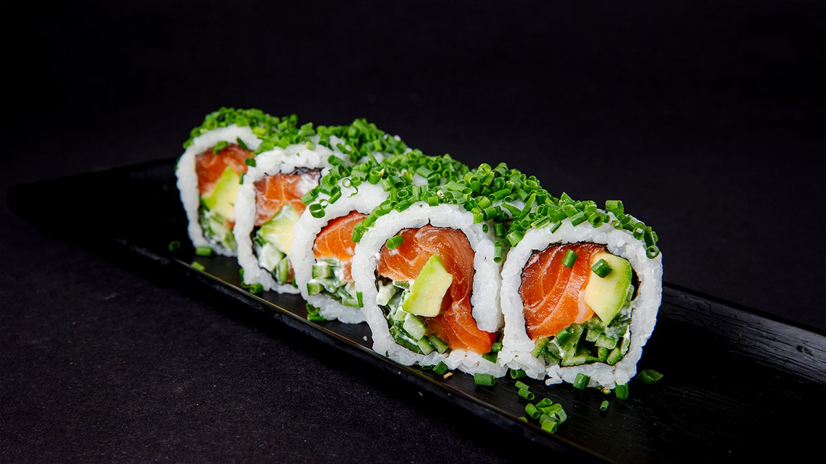 סלמון, אבוקדו, מלפפון וגבינת שמנת בציפוי עירית קצוצה