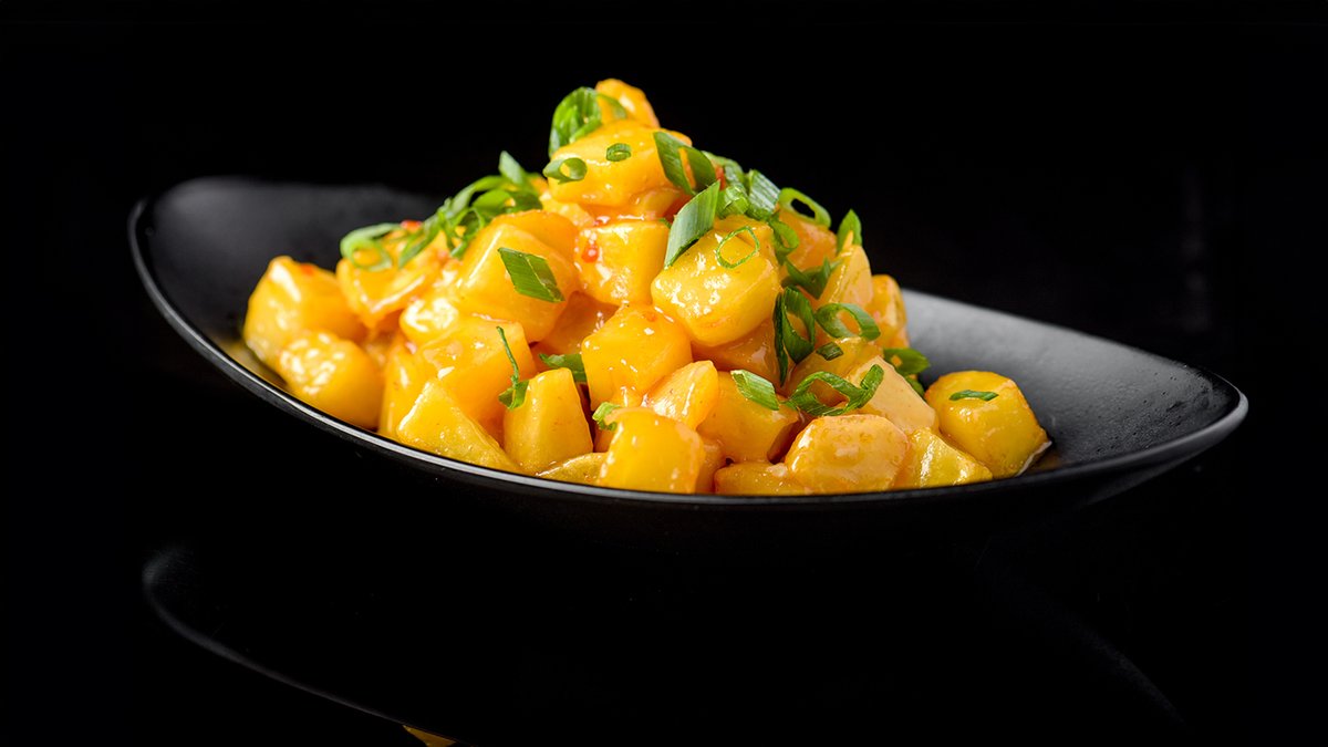 קוביות תפו“א פריכות ברוטב צ‘ילי, קוקוס פיקנטי ושומשום