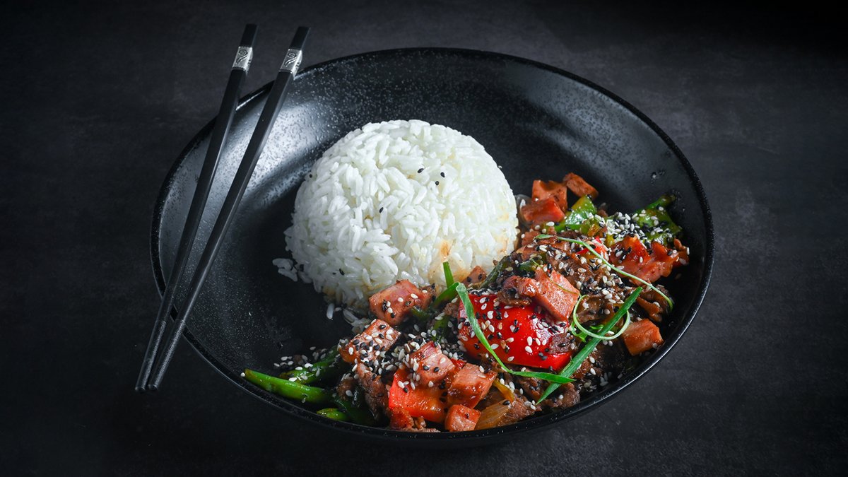 אטריות חיטה, חזה אווז מעושן, פלפלים, שעועית, בצל, בצל ירוק ונבטים ברוטב סויה מתוק חריף