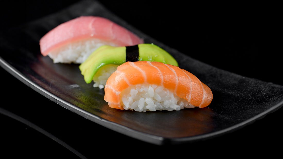 'אצבע אורז עטוף בסלמון, טונה ואבוקדו. 3 יח
