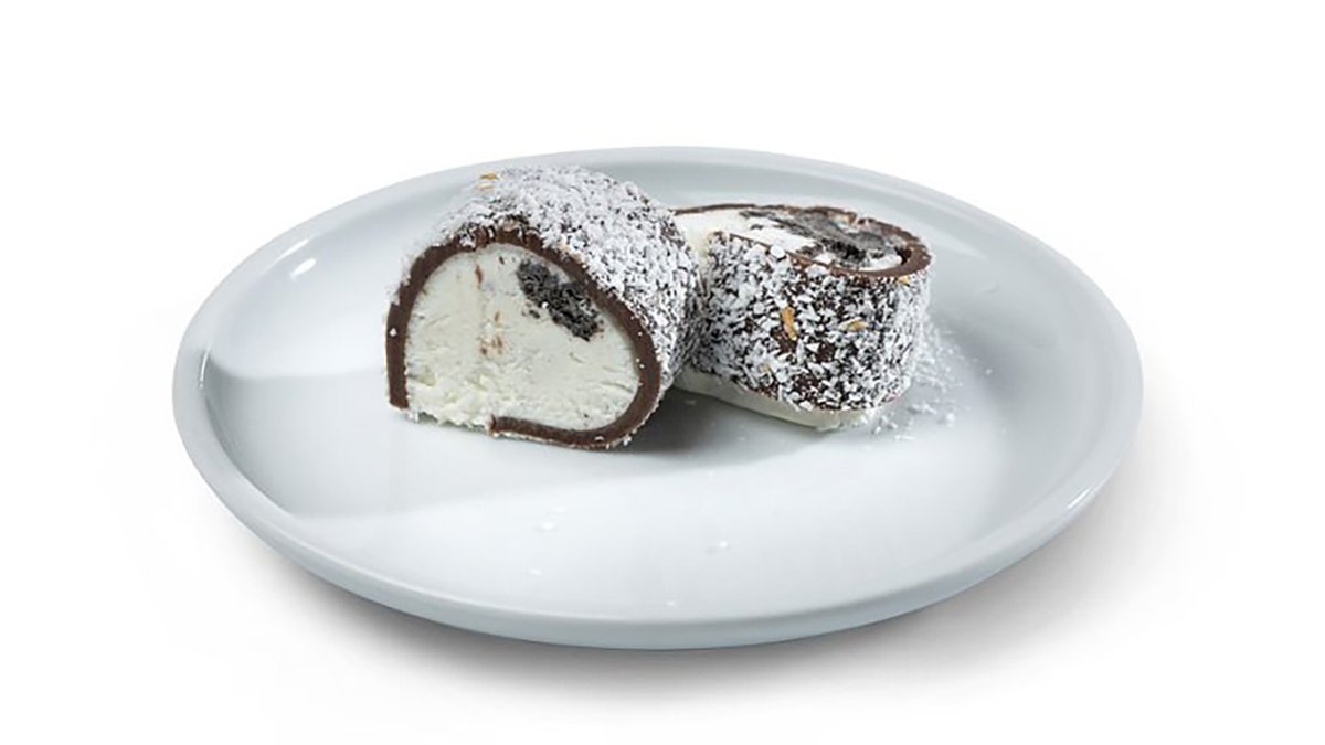 רול של קרם וניל, עטוף בשכבת טראפלס שוקולד וקוקוס קלוי