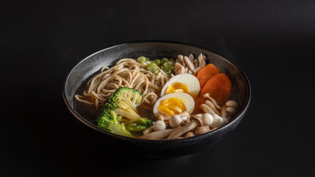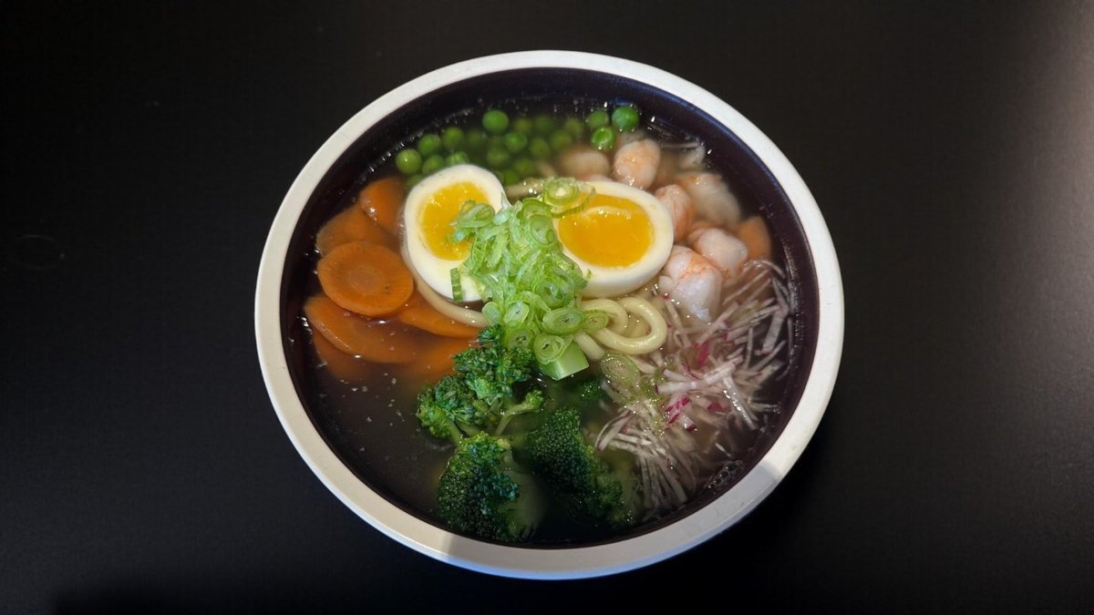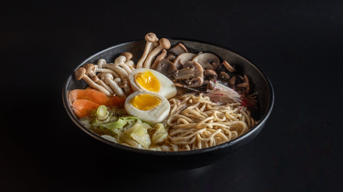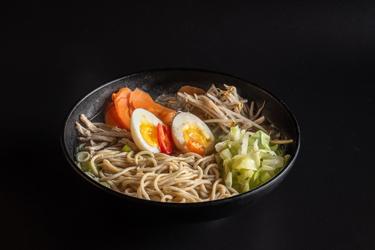 אטריות חיטה, גזר, כרוב, נבטים, בצל, פלפלים, בצל ירוק ושעועית ברוטב סויה, ג‘ינג‘ר ושום