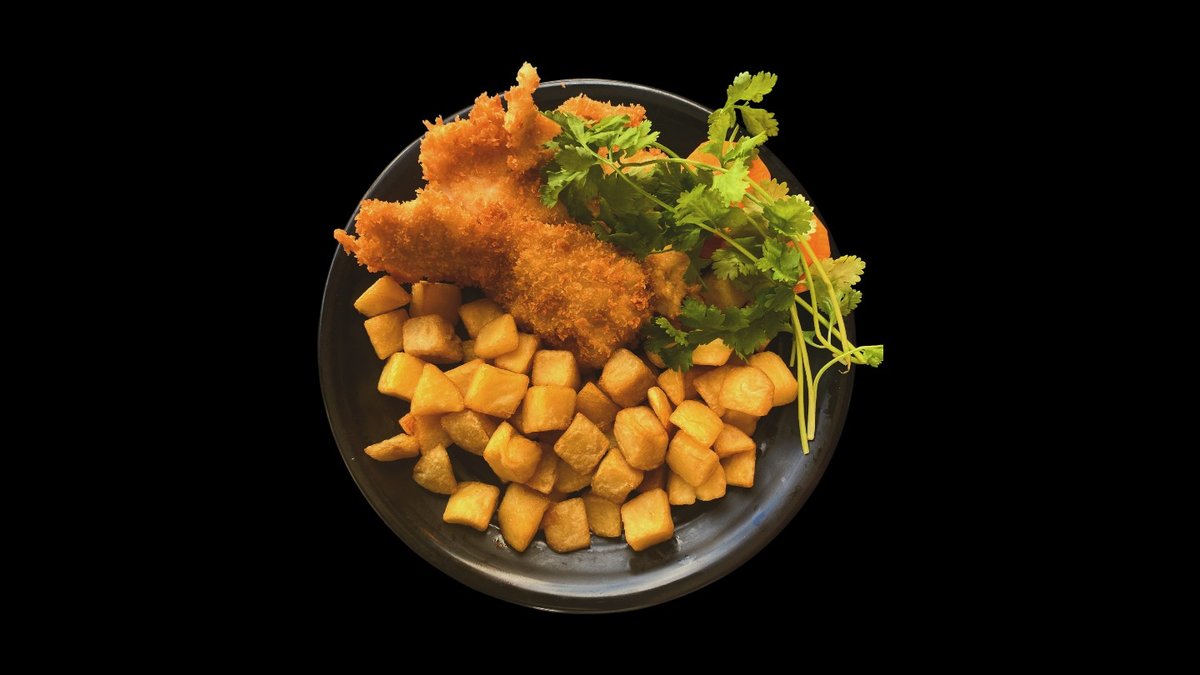 חזה עוף בציפוי פנקו, מוגש עם תוספת ושתייה לבחירה