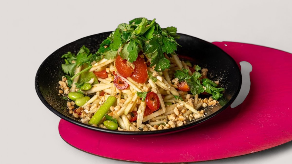 פפאיה, פולי אדממה , עגבניות שרי , פלפל צ'ילי, בצל ירוק בוטנים וכוסברה ברוטב תמרינדי