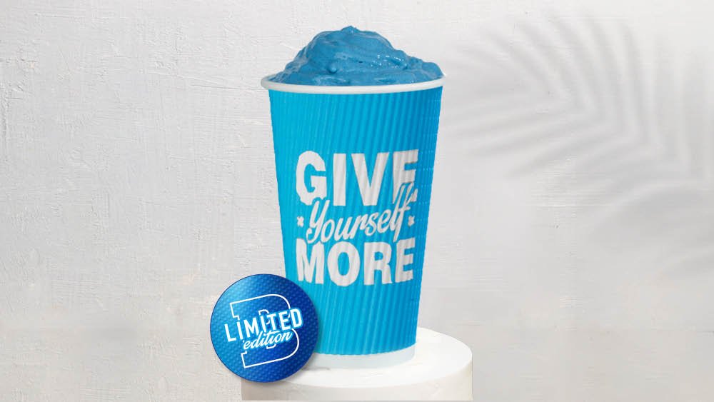 ספירולינה כחולה, חליטת תה שחור, אפרסק, לימונדה, ואקסטרה כדורי מנגו וטפיוקה המשקה יוצא בכוס שקופה עם מכסה תואם