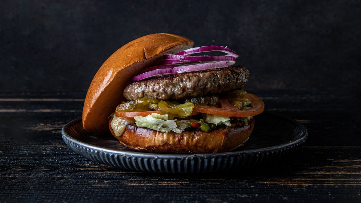 המבורגר מחלבון אפונה וסויה, חסה לאליק, עגבניה, חמוצים ובצל מטוגן ורוטב ברבקיו